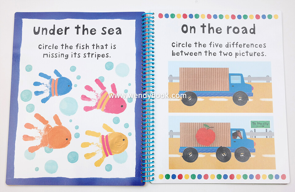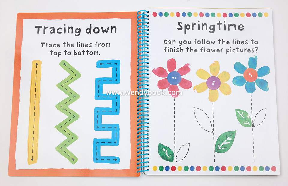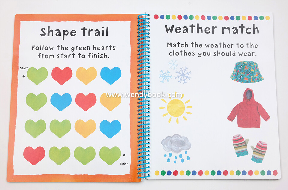 The pages are wipe-clean so children can do the activities over and over again and the spiral binding allows the book to sit flat on a table. This workbook also comes with a wipe-clean pen attached to the spiral.