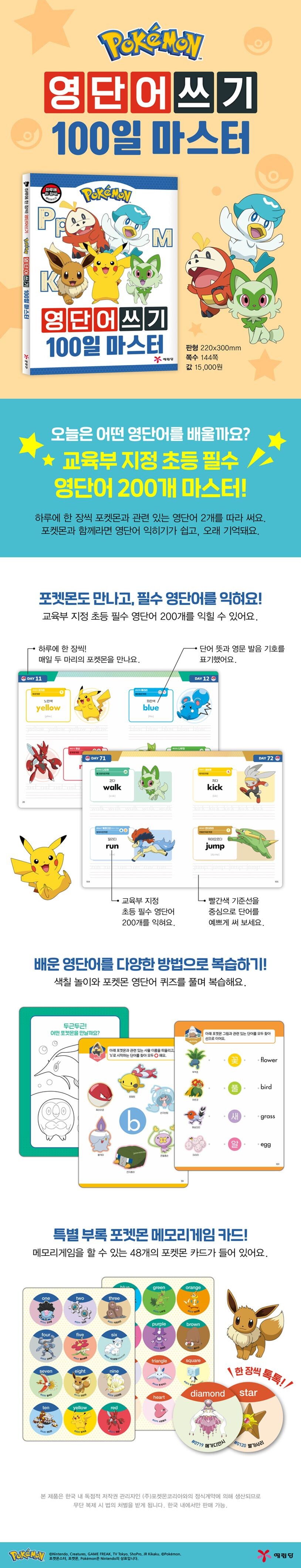 포켓몬을 만나면서 영단어도 하나씩 익히면 얼마나 좋을까요? 교육부 지정 초등 필수 영단어를 자연스럽게 익힐 수 있는 <포켓몬 영단어쓰기 100일 마스터>가 출시되었습니다. 200마리나 되는 다양한 포켓몬과 함께라면 영단어 익히기가 쉽고, 더 오래 기억될 수 있습니다. 이 책은 Numbers, Colors&Shapes, Farm Animals, Things at Home, Bodies&Feelings 등 다양한 카테고리의 영단어를 하루에 한 장, 날마다 2개씩 쓰면서 공부하도록 구성하였습니다. 포켓몬과 관련 있는 단어를 반복해서 쓰다 보면 더욱 재미있게 익힐 수 있어요. 10일마다 구성된 색칠 놀이와 포켓몬 영단어 퀴즈도 풀며 다양하게 복습도 할 수 있습니다. 함께 제공되는 포켓몬 메모리게임 카드로 메모리게임도 해 보세요. 영단어에 대한 흥미와 자신감이 쑥쑥 자라날 것입니다.