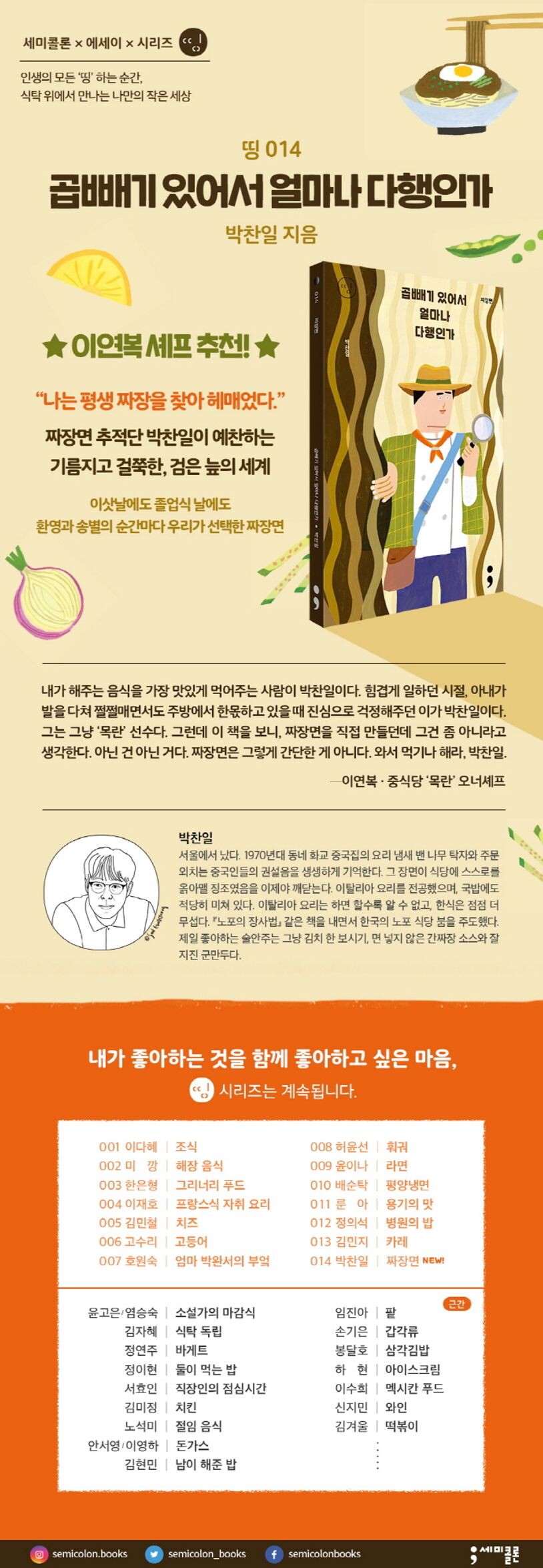 세미콜론에서 출간하는 음식 에세이 ‘띵 시리즈’의 열네 번째 주제, ‘짜장면’ 편을 쓴 장본인이기도 하다.