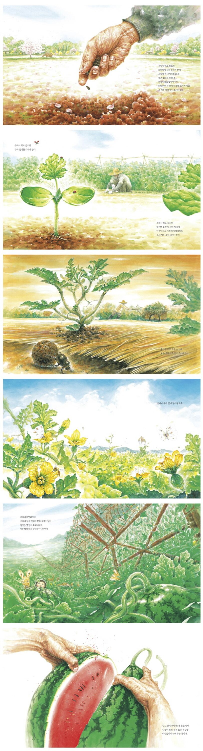 이 그림책은 우리가 쉽게 사먹는 수박을 얻기 위해 누가 무슨 일을 어떻게 하는지,
