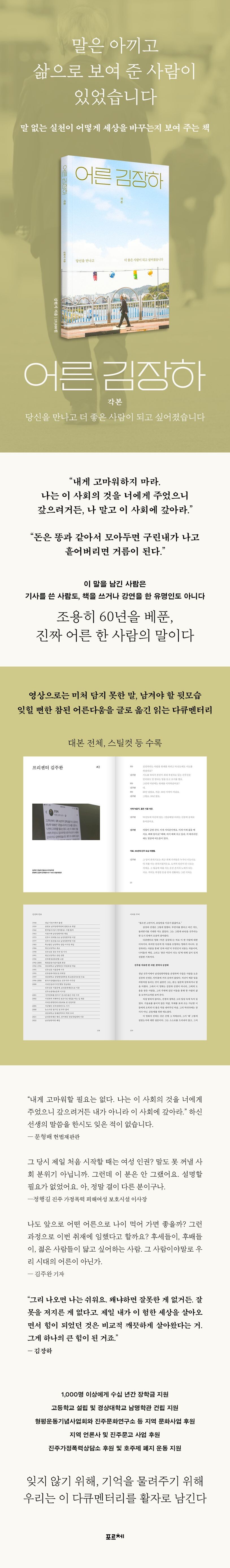 이 책은 《어른 김장하》 다큐멘터리 각본집으로 어른 김장하 선생의 울림이 있는 말씀을 담은 각본 전체와 미공개 스틸컷,