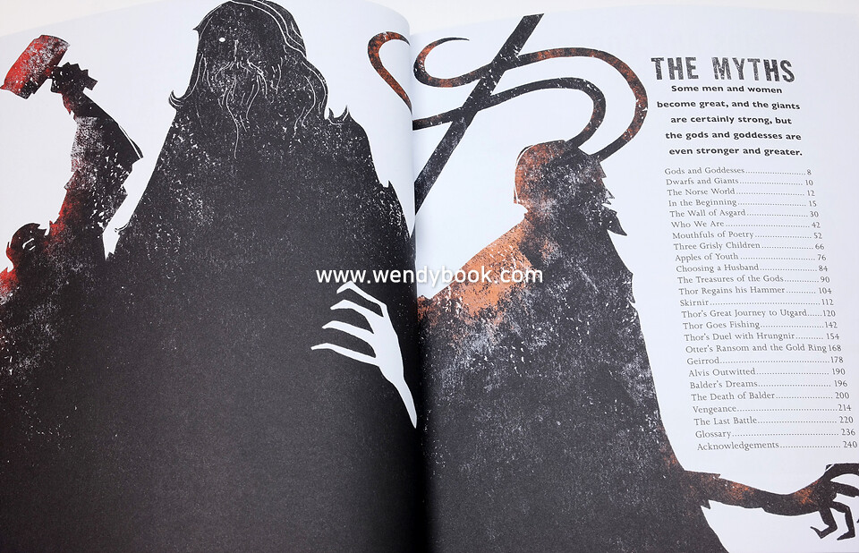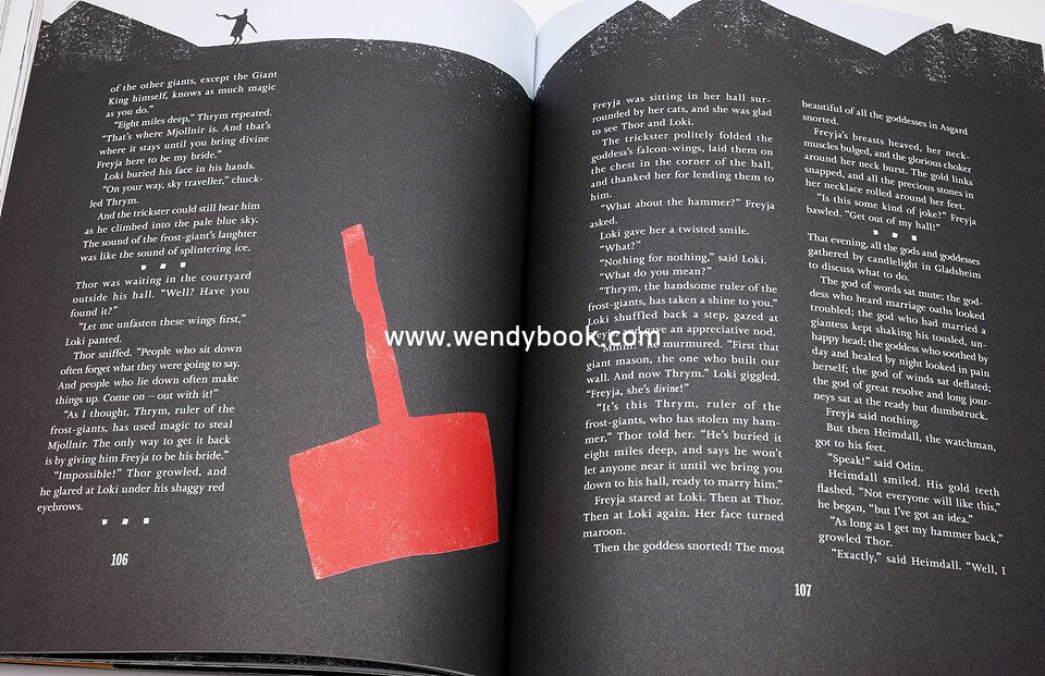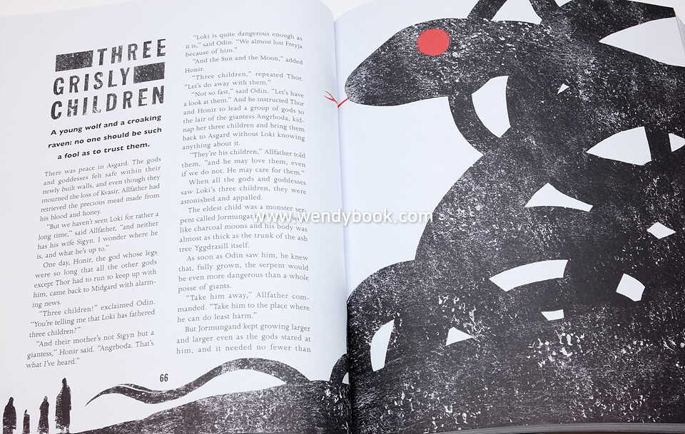 홀랜드의 이야기도 훌륭하지만, 책을 가득 채운 심플하면서도 강렬한 검은색과 선심 쓰듯 살짝 더해진 다양한 색감들이 북유럽 신화의 웅장하고 신비로운 느낌을 잘 살려서 그림에 더 반하게 되는 책이기도 합니다.