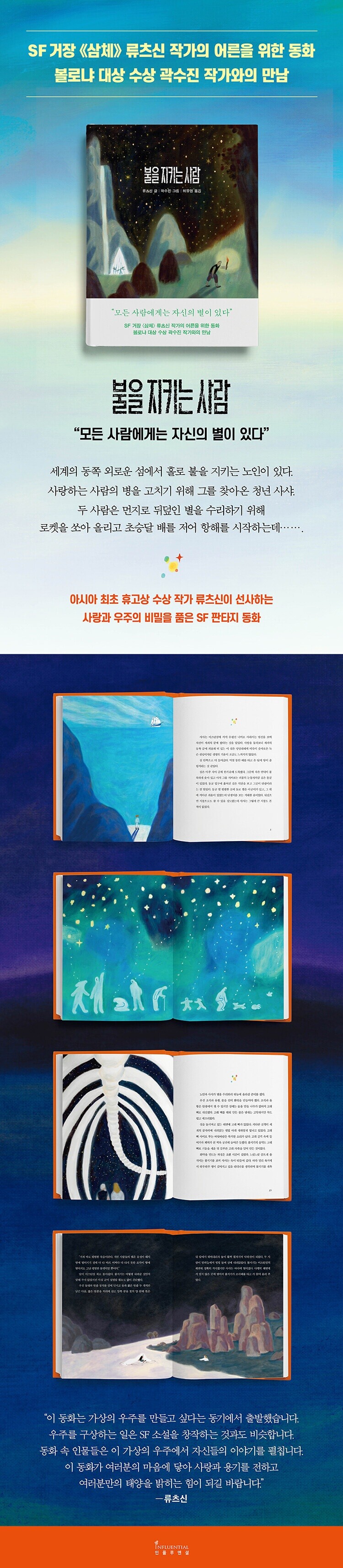 《삼체》의 작가 류츠신이 처음이자 유일하게 쓴 동화 작품 《불을 지키는 사람》은 세상의 끝에서 매일 태양에 불을 지피는 불지기 노인,