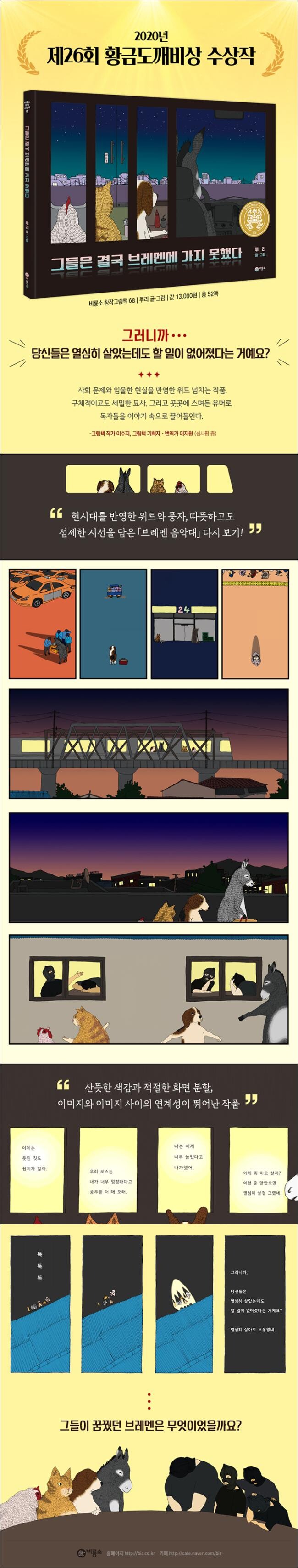 『그들은 결국 브레멘에 가지 못했다』는 표지에서부터 당나귀, 개, 고양이, 그리고 닭이 각자의 위치에서 창밖을 바라보는 면 분할 구성으로 눈길을 잡아 끈다. 대중적으로 친숙한 「브레멘 음악대」는 버림 받은 동물들이 각자 특기를 살려 브레멘에 가서 음악대가 되고자 하는 이야기이다. 이 그림책은 「브레멘 음악대」의 결말을 이미 제목에서부터 강렬하게 드러냄으로써 오히려 독자들로 하여금 강한 호기심을 불러일으킨다. 앞뒤 면지는 이야기를 더욱 풍성하게 해 주는 역할을 한다. 앞면지는 네 동물과 도둑들이 살아가는 일상을 그려내 숨은그림찾기 하듯 등장인물을 하나하나 찾아보는 재미가 있다. 또 앞으로 닥칠 암울한 이야기를 예시하듯 흑백으로 처리했다. 첫 장을 넘기면 모범 택시 운전수 당나귀가 늙었다는 이유로 택시 회사에서 해고 되는 장면으로 이야기가 시작된다. 기존의 <브레멘 음악대>의 큰 이야기 틀을 유지하면서 현대적 배경과 소재를 개성 있게 각색했다. 편의점에서 아르바이트를 하다가 인상이 험상궂다는 이유로 해고 당한 고양이, 길에서 두부를 팔다 쫓겨난 닭, 그리고 일하던 가게가 이사를 하게 되어 일자리를 잃은 개까지. 모두 제 각각의 사연으로 갈 곳을 잃는다. 그렇게 우연히 지하철에서 만난 그들은 어디로 갈지 모르는 채 함께 내려 터벅터벅 걸어 가다가 도둑들이 있는 집 앞에 멈춰 선다. 그리고 도둑들은 동물들의 이야기를 듣고 깜짝 놀란다. “아니, 열심히 살았는데도 할 일이 없어졌다고? 열심히 살아도 소용 없네.’ 그들은 자신들이 가지고 있는 소중하고도 마지막 남은 단 한가지 음식과 식기를 모아 함께 김치찌개를 만들어 먹는다. 그리고 상상해 본다. 만약에, 아주 만약에 힘을 합쳐 김치찌개 가게를 차렸으면 어땠을까? 하고 말이다. 이야기는 이렇게 끝이 나지만, 마지막 장을 넘기면 열심히 김치찌개 가게를 준비하는 도둑들과 동물들의 모습이 뒷면지에서 이어진다. 또 흑백이었던 앞면지와 다르게 면지가 형형색색 색깔을 입고 있어 희망찬 느낌을 준다.