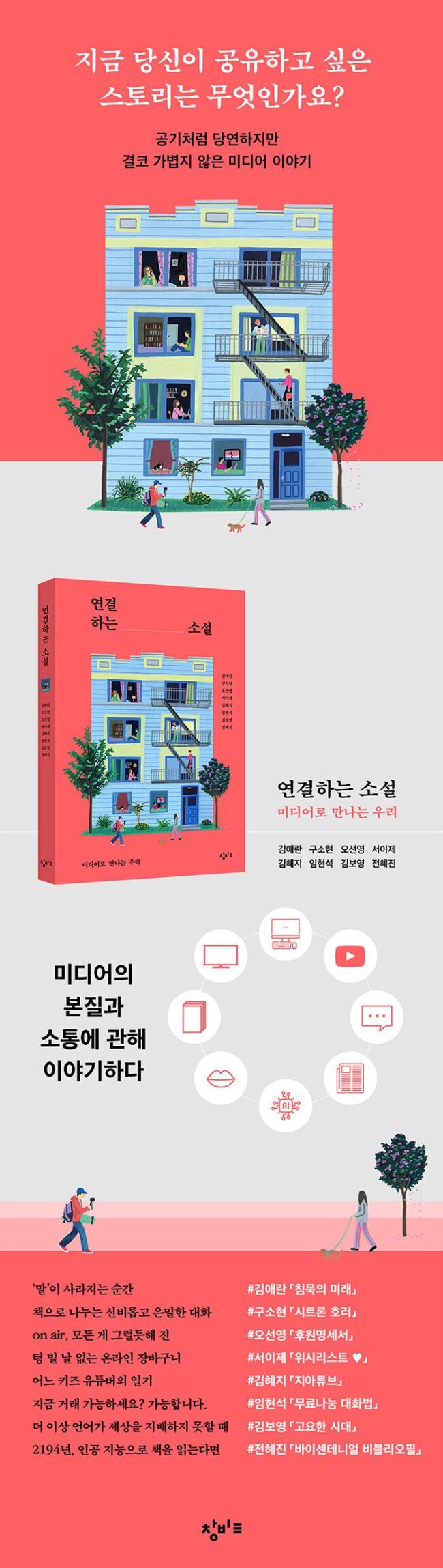 미디어를 테마로 한 단편 8편을 엮은 『연결하는 소설: 미디어로 만나는 우리』가 출간되었다. 소설집에는 미디어의 본질부터 미디어를 통한 소통, 미디어 리터러시까지, 김애란, 구소현, 오선영, 서이제, 김혜지, 임현석, 김보영, 전혜진 작가가 그려 낸 미디어 이야기가 담겨 있다. 오늘도 우리는 미디어로 세상과 만난다. 아침 등굣길 혹은 출근길에 보는 영상과 뉴스, 점심 메뉴로 어떤 것을 먹을지 동료와 나누는 메신저 대화, 유독 맛있게 느껴진 음식을 실시간으로 공유하는 SNS의 사진과 해시태그 그리고 잠들기 전 잠깐 시간을 내서 읽는 책까지. 때론 나의 스토리를 드러내기도, 타인의 스토리를 엿보기도 하며 우린 24시간 누군가와 연결된다.