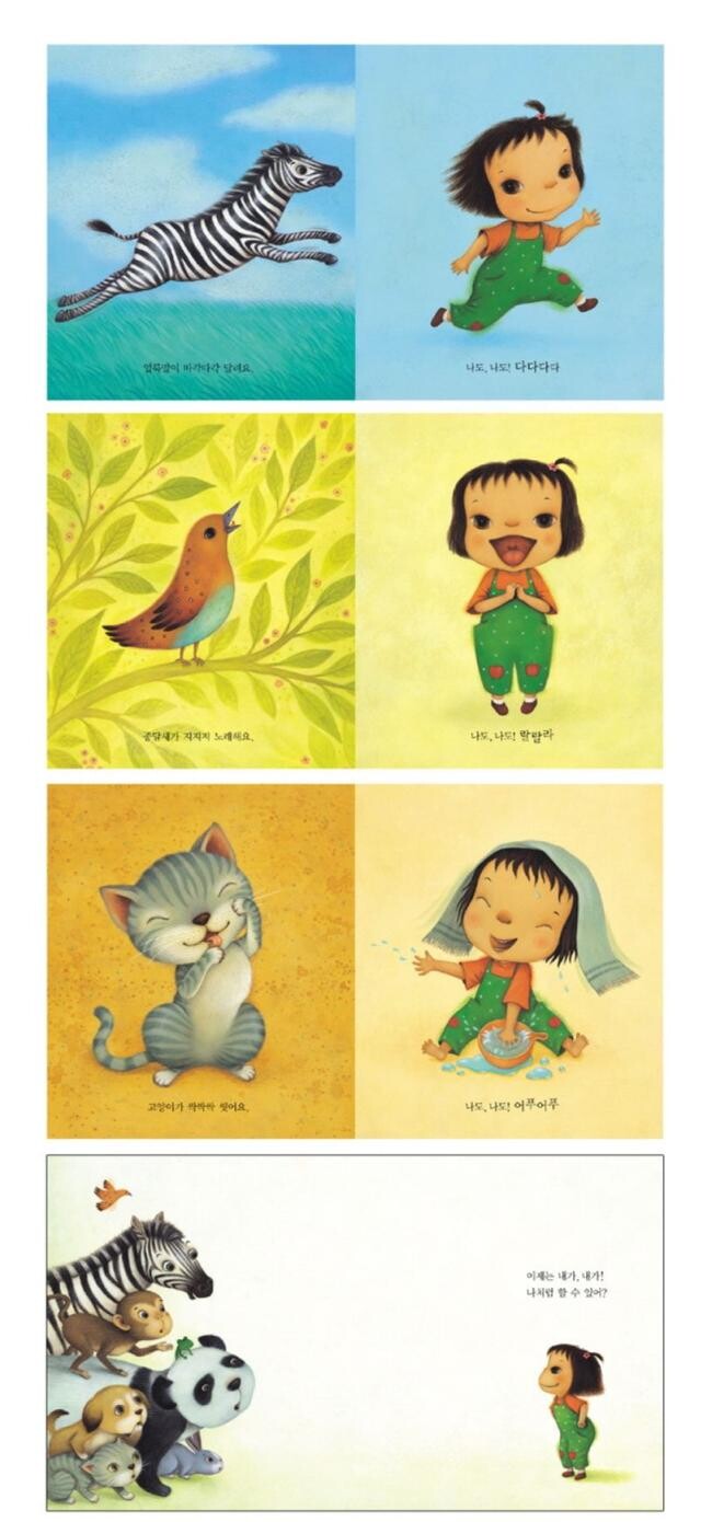 “나도, 나도!”는 그맘때 아기들이 늘 입에 달고 있는 말이다. 『나도 나도』의 깜찍한 아기도 그렇다. 얼룩말이 힘차게 달리는 모습을 보면 아기도 달려 본다. 즐겁게 지저귀는 종달새를 보면 아기도 예쁘게 노래한다. 데구루루 구르는 판다를 보고, 맛있게 먹는 토끼를 보고, 응가를 하는 강아지를 보면 아기도 “나도, 나도!” 외치며 그 모든 것을 따라해 본다. 그렇다고 늘 따라하기만 하는 것은 아니다. 동물들을 따라하던 아기는 이제 자기가 먼저 해 보일 거라며 자랑한다. 그러고는 엄마에게 달려가 “쪽!” 뽀뽀해 준다.