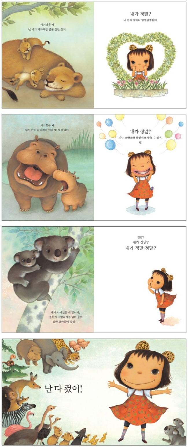 <내가 정말?>은 엄마와 아이가 주고받는 행복한 대화로 이루어져 있습니다. 엄마는 아기였을 때 아기 동물처럼 이것도 저것도 못했다고 짓궂게 이야기를 합니다. 그러자 아이는 “내가 정말?” 깜짝 놀라며 자신이 할 수 있는 것들을 말하고 직접 선보이지요. 어른의 눈에는 특별할 것도 없고 여전히 미숙한 어린아이지만 아이 표정에는 자신감이 넘칩니다. 그림책에는 나와 있지 않지만 그걸 보고 있는 엄마의 얼굴은 어땠을까요? 아마도 환한 미소를 띠며 “그럼 우리 아이, 다 컸지.” 하고 엉덩이를 톡톡 두드리지 않았을까요?