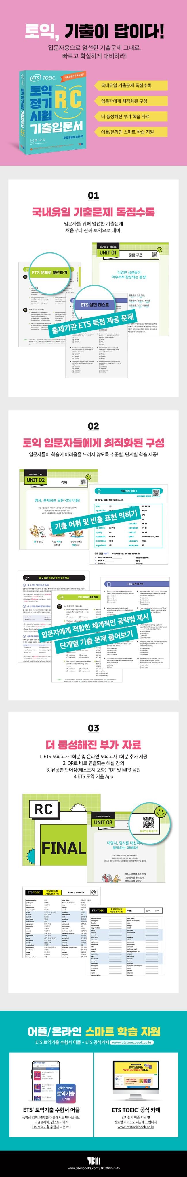 초급 수험자들이 본격적으로 문법과 토익 문항을 공부하기 전에 기본 문법 개념을 익힐 수 있도록 쉽고 체계적으로 구성했다. 해당 Unit에서 가장 핵심이 되는 개념을 삽화를 통해 쉽게 익힐 수 있도록 정리했다. 학습 후 잘 이해했는지를 점검할 수 있도록 간단한 기초 QUIZ를 제공한다.