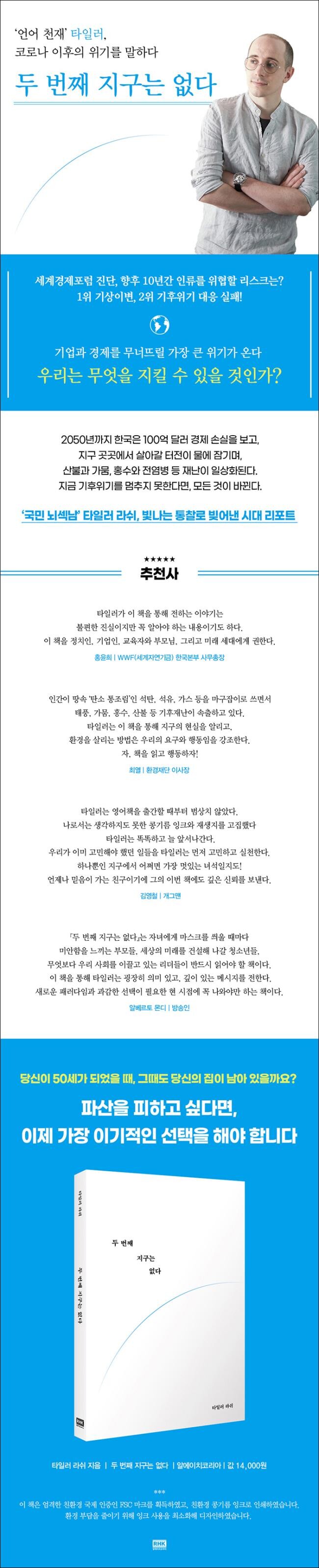 “환경을 말하지 않고는 누구도 잘 살 수 없다”‘언어 천재’ 타일러가 기후위기를 말하는 이유《두 번째 지구는 없다》는 방송계의 대표적인 ‘언어 천재’, ‘뇌섹남’으로 통하는 타일러 라쉬의 첫 단독 도서이다. 기후위기 해결은 타일러의 오랜 꿈으로, 환경은 그가 오랫동안 품어온 화두다. 타일러는 2016년부터 WWF(세계자연기금) 홍보대사로 활동하며 환경 문제의 심각성을 알려왔다.《두 번째 지구는 없다》를 통해 타일러는 자연과 단절된 현대인을 ‘빅박스스토어’에 갇힌 채 일평생을 살아온 사람에 비유한다. 인공 시설과 인간이 만든 시스템을 단단하고 영구적인 것처럼 여기며, 인간이 자연의 일부이며 연결되어 있다는 사실을 외면한다는 지적이다. 수도를 열면 물이 쏟아지지만, 그 물이 어디에서 왔는지 궁금해하지 않고, 우리가 숨 쉬는 공기가 어디에서 만들어졌는지 궁금해하지 않는다. 산업과 소비가 자연에 미치는 영향을 고려하지 않으며, 그 결과 인간은 기후위기를 유발해 지구상 모든 생명체를 멸종 위기로 빠뜨리고 있다.타일러는 《두 번째 지구는 없다》에서 자연과 인간 존재를 연결하는 성찰과 환경 문제를 보는 새로운 시각을 제시한다. 특히 타일러는 이 책의 디자인과 제작에 깊이 참여해 친환경 출판에 힘을 실었다. 《두 번째 지구는 없다》는 저자의 뜻을 반영하여 엄격한 친환경 인증인 FSC 마크를 획득하고, 친환경 콩기름 잉크로 인쇄했다. 또 환경 부담을 덜기 위해 잉크 사용을 최소화한 파격적인 디자인을 적용했다.환경이 바로 경제, 기후위기가 모든 것을 바꾼다위기의 시대에 우리는 무엇을 지킬 수 있을 것인가타일러는 환경 문제야말로 경제 문제라고 말한다. 기후위기는 부동산, 증시 등 경제 시스템을 무너뜨릴 가장 큰 리스크라는 것이다. 세계경제포럼은 향후 10년간 인류에게 다가올 위험 요인으로 1위 기상이변, 2위 기후위기 대응 실패를 든 바 있다. WWF(세계자연기금)도 지금과 같이 자원을 소비할 경우 한국은 2050년까지 최소 100억 달러(약 12조 원)의 GDP 손실을 피할 수 없다고 경고한다.타일러는 경제적 외부 효과를 외면한 채 가격을 산출하는 방식에 환경 문제의 핵심이 있다고 역설한다. 화석 연료 사용이 환경에 얼마만큼 큰 영향을 미칠지, 우리가 배출하는 일회용품이 인간에게 어떻게 돌아올지, 진짜 값을 외면한 가격이 우리에게 비싼 값으로 돌아오고 있다는 지적이다. 타일러는 해결의 실마리로 ‘선택권’을 강조한다. ‘환경’을 기준으로 삼아 탄소 배출 저감을 실천하는 기업을 선택하고, 환경 문제를 외면하는 기업 제품은 불매해야 한다고 말한다. 또한 환경을 위한 더 나은 선택을 고민하고 요구해야 한다고 주장한다.생각은 가장 적합한 형태에 담겨야 한다종이부터 잉크까지, 친환경 출판 실천타일러 라쉬의 『두 번째 지구는 없다』는 디자인부터 제작까지, 출판의 모든 과정에서 환경을 고려했다. 환경에 관한 메시지를 가장 친환경적인 형태 안에 담기 위해 저자는 디자인과 제작 전반에 적극 참여했다. 타일러는 FSC 인증 등 친환경 제작 방식과 잉크 사용을 획기적으로 줄인 디자인을 제안했다.책에 사용한 모든 종이는 가장 엄격한 친환경 국제 인증인 FSC®인증을 획득했다. FSC 인증은 산림자원 보존과 환경 보호를 위해 국제산림관리협의회(Forest Stewardship Council)에서 만든 산림 관련 친환경 국제 인증이다. FSC 인증 종이를 사용하면 지속가능한 방식으로 관리된 나무를 선택해 숲과 야생 동물을 모두 보전할 수 있다. 또한 친환경 콩기름 잉크로 인쇄했으며, 불필요한 종이 낭비를 막기 위해 띠지를 생략하고 종이 손실이 적은 판형을 선택했다.