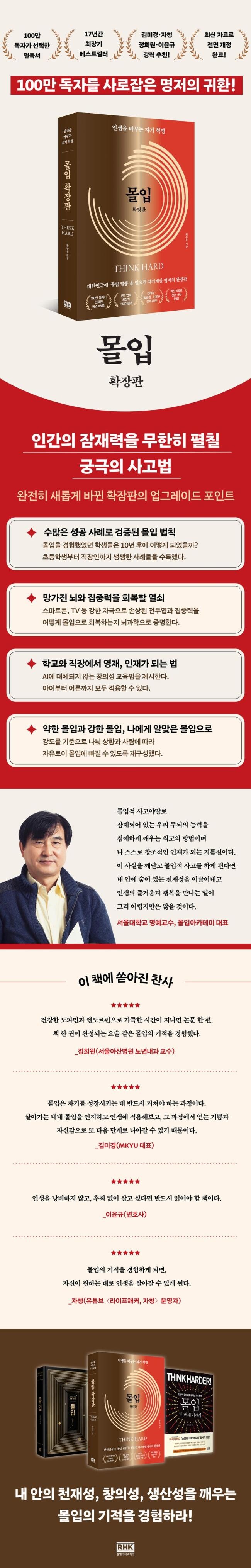 2007년 출간되어 전 국민에게 ‘몰입’ 열풍을 불러일으킨 베스트셀러 『몰입』이 전면 개정되어 돌아왔다. 이번 확장판은 단순히 290쪽에서 456쪽으로 분량을 추가한 것에 그치지 않고, 몰입을 통해 17년간 축적된 수만 건의 데이터와 뇌과학 지식, 변화한 시대상을 반영하여 초판의 내용을 전면 업그레이드해 더욱 특별하다.