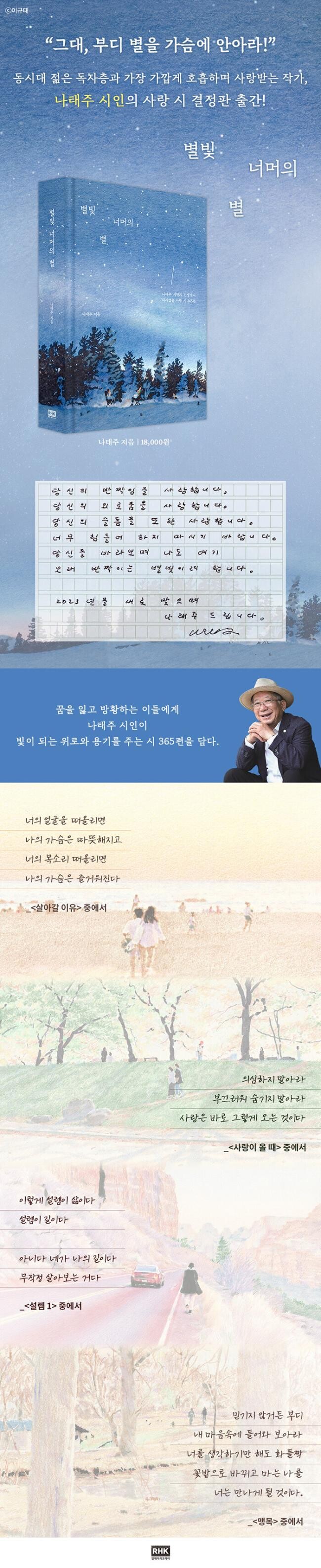 우리는 코로나19라는 전대미문의 보이지 않는 현상과 싸우면서 지치고 힘든 시기를 건너왔다. 또한 최악의 경기침체로 인해 불안하고 우울한 감정에 휩싸여 방향성을 잃고 흔들리고 있다. 그렇게 버텨온 시간 속에 어김없이 새날은 밝아왔다. 나의 상황은 여전하지만, 세상은 야속하게도 잘만 돌아가고 있는 지금. “나에게 희망이 있다고, 나에게 내일이 있다고, 나에게 사랑이 있을 거라고 손짓하는” 시집이 있다. 바로 한국인이 가장 사랑하는 시인 나태주의 『별빛 너머의 별』 시선집이다. 이 시선집은 시인의 인생에서 굴레처럼 반복됐던 만남과 동행, 이별과 해후의 서사가 담긴 사랑 시 365편으로, 흔들리는 이 시대를 살고 있는 사람들에게 용기와 희망을 전하고 있다.