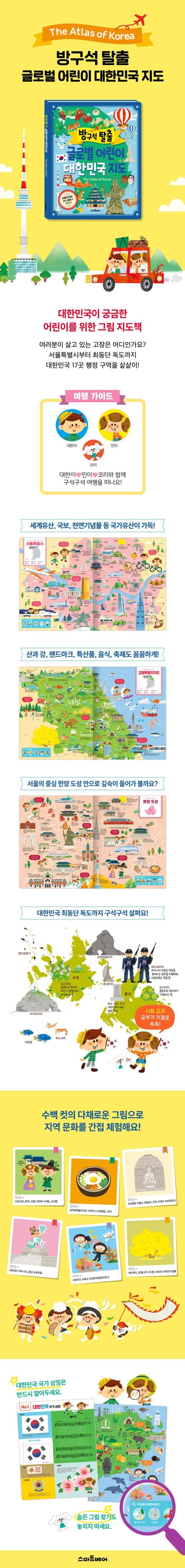 세상 구석구석이 궁금한 어린이들의 호기심을 풀어 주었던 <방구석 탈출 글로벌 어린이 세계 지도>에 이어, 우리나라 방방곡곡을 알고 싶은 어린이들을 위해 대한민국 편이 출간되었습니다.