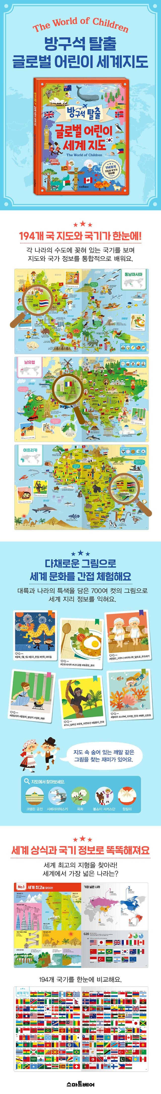 널찍하게 펼쳐진 12개의 각 대륙 지도에는 총 194개 국의 최신 국가 정보가 총망라되어 있습니다. 대륙 지도에는 국경선으로 구분된 각 나라의 지형과 이름은 물론 수도의 위치와 국기가 한눈에 표기되어 지리와 국가 정보를 통합적으로 배울 수 있습니다.