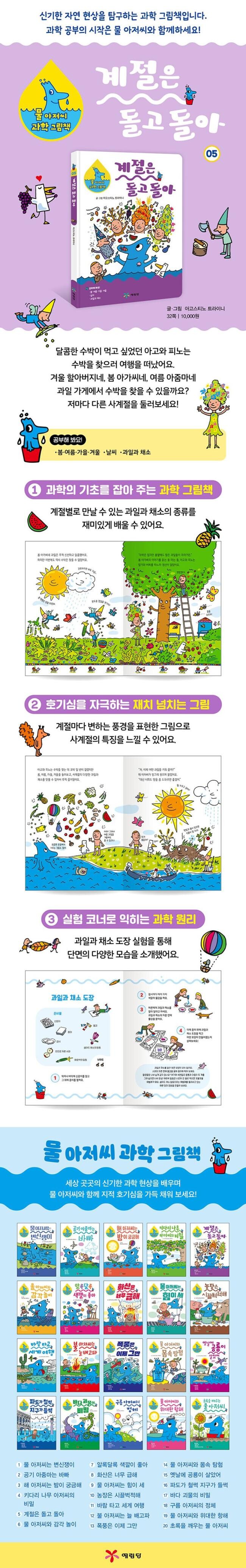 이탈리아의 인기 작가, 아고스티노 트라이니의 [물 아저씨 과학 그림책] 시리즈를 소개합니다. 세상 곳곳의 과학 현상을 배우며 지적 호기심을 가득 채워 보세요! [물 아저씨 과학 그림책]은 신기한 자연 현상을 탐구하는 과학 그림책입니다. 물, 공기, 해 같은 자연물을 주인공으로 삼아 자연스럽게 이야기를 풀어냅니다. 과학을 처음 시작하는 어린이도 과학 원리를 쉽게 이해할 수 있습니다.