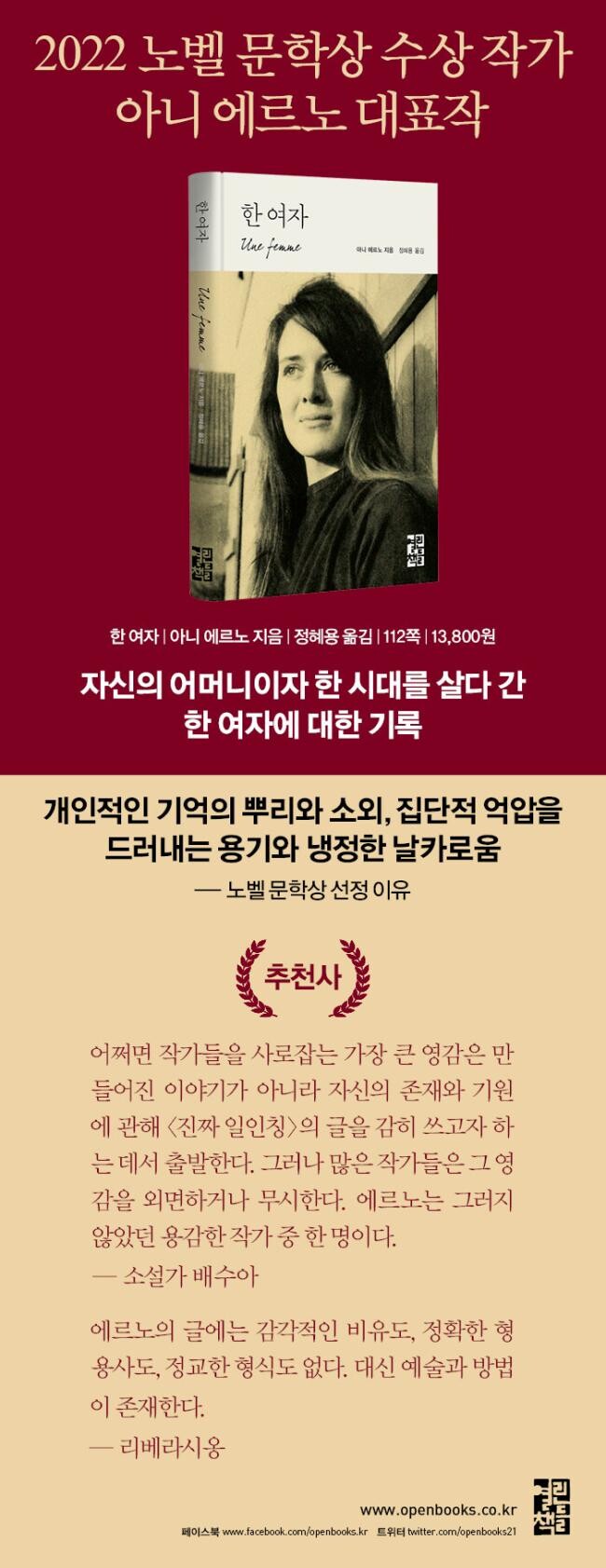 보다 정확히는, 내가 쓰려고 하는 것은 가족적인 것과 사회적인 것의 접점에, 신화와 역사의 접점에 위치하리라. 나의 계획은 문학적인 성격을 띤다. 말들을 통해서만 가닿을 수 있는 내 어머니에 대한 진실을 찾아 나서는 것이기 때문이다. (……) 하지만 어떤 식으로든 문학보다 아래 층위에 머무르길 바란다. ― 『한 여자』(18~19면)