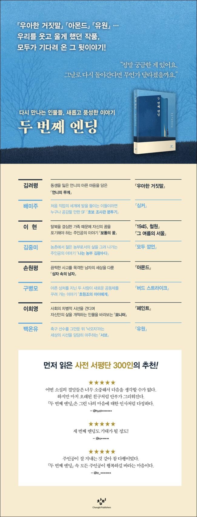 원작 없이 읽는 사람들에게는 원작으로 이끄는 매력을, 원작이 마음에 들어서 읽는 사람들에게는 마음이 쓰이는 친구를 다시 만나는 경험을 준다. 몇몇 작품의 외전이 궁금해서 책을 집어 읽다 보면, 모든 작품의 원작으로 발길을 끌게 만드는 책인 것 같다. 이 중에 한 작품이라도 읽어 봤다면 ‘두 번째 엔딩’을 읽어 보시라! ― @sp********