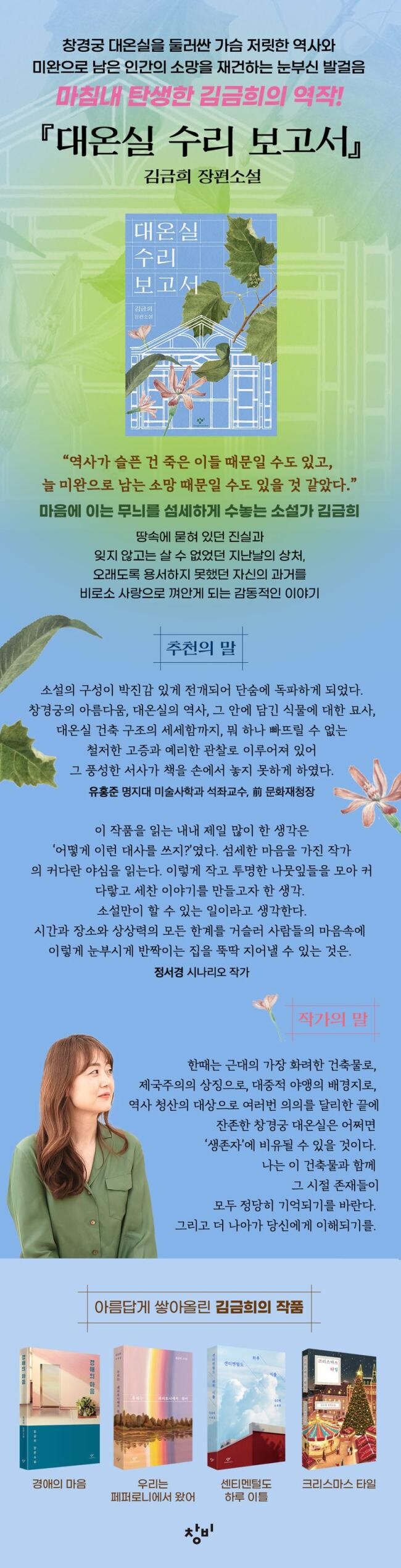 『대온실 수리 보고서』는 내가 소설로 가본 가장 폭넓고 긴 시간대였다. 당연히 많은 자료의 도움을 받아야 했다. 긴 참고자료 목록을 남겨둔 건 이야기를 두텁게 만들기 위한 작가의 추적이 어떤 식으로 뻗어나가는가를 밝히고 싶은 생각이 들어서였다. 인물의 동작과 옷차림, 말씨, 표정, 거리의 활기와 적막, 집안 마루의 감촉과 대온실의 유리창과 대나무발, 긴 잎의 바나나와 맹수사의 동물들, 풍랑에 흔들리는 상선과 눈 쌓인 피난길 서로의 안전을 당부하는 불안한 얼굴들, 패전의 무게를 곁고 남하하는 이들의 걸음걸이. 이 모든 것들을 이해하기 위해 어떤 모색을 했는가를. 그래서일까. 책 작업을 하는 동안 어떤 소설보다 ‘이해한다’라는 표현을 자주 썼다는 걸 깨달았다. 도서관과 공유 오피스와 카페를 전전하며 자료들을 읽다가 마침내 이해에 다다르면 슬픔이 차올라 자리를 박차고 나와 걷던 시간들이 이 건조한 목록에 담겨 있다. 내가 한 이해는 깨진 유리 파편처럼 그 시절을 자그맣게 비추고 있을 뿐이겠지만 한참을 걸어야 감정이 식을 만큼 적어도 내게는 너무 생생한 것이었다. 나는 자주 기도했다.