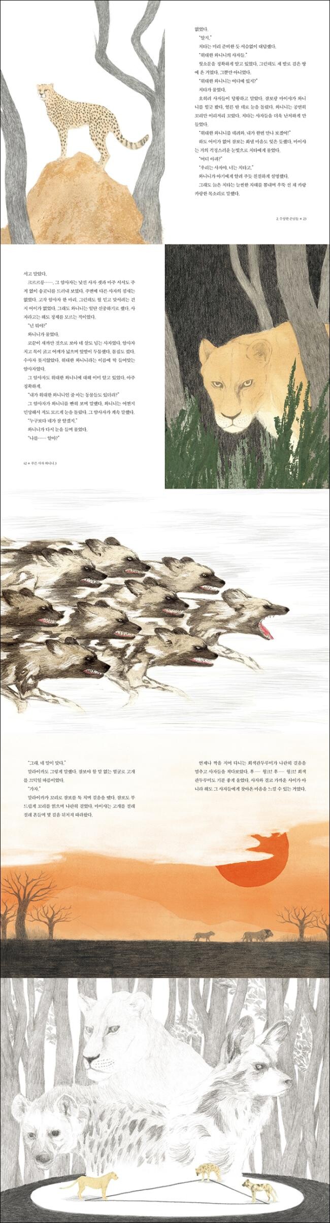 “마음껏 포효해도 되는 땅에서 이리 뒹굴, 저리 뒹굴, 게으르게 지내고 있지만 그런 날이 계속될 리는 없습니다. 우기와 건기가 오가는 것이 초원의 법이지요. 와니니 무리는 다시금 어려운 날을 맞이합니다. 그래도 괜찮습니다. 와니니 무리는 알고 있거든요. 좋은 날이 계속되지 않는 것처럼, 힘든 날도 계속되지 않는다는 것을요.” _「작가의 말」 중에서