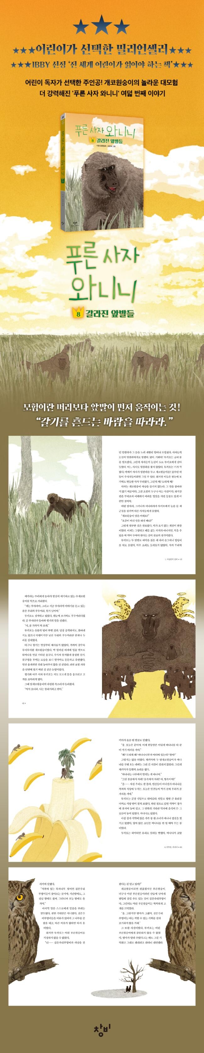누적 100만 부 이상 판매되며 우리 아동문학의 대표작으로 자리매김한 ‘푸른 사자 와니니’ 시리즈가 여덟 번째 이야기로 돌아왔다. 이 시리즈는 “대자연을 배경으로 펼쳐지는 대하동화”라는 호평과 함께 출간 10주년을 맞은 2025년 권정생문학상을 수상하며 작품성을 다시금 입증했다. 8권의 주인공은 1권 출간 이후 어린이 독자들이 주인공으로 등장시켜 달라고 가장 많이 요청해 온 동물, 개코원숭이다. 태어난 무리를 떠나 혼자가 된 수컷 개코원숭이 ‘투키오’는 초원을 떠돌다 우연히 사파리 차에 올라타 인간의 리조트에 도착하고, 그곳에서 인간이 남긴 음식에 의존해 살아가는 개코원숭이 무리를 만난다. 힘들게 사냥하지 않아도 매일 먹이가 주어지고, 잘 정돈된 풀밭에서 마음껏 뒹굴 수 있는 리조트는 투키오에게 천국처럼 보인다. 하지만 평화로운 풍경 뒤에는 우두머리의 눈치를 보며 살아야 하는 불합리한 질서가 감춰져 있다. 처음에는 안락한 일상에 만족하던 투키오도 점차 억압과 부조리를 깨닫고 자유를 찾아 초원으로 돌아가기로 결심한다. 새롭게 떠난 모험에서도 투키오의 엉뚱하고 대담한 선택들이 흥미진진하게 펼쳐지며, 예측할 수 없는 전개가 시종일관 통쾌한 웃음을 선사한다. 후속작을 손꼽아 기다려 온 독자들의 기대를 충분히 만족시킬 만한 작품이다. 이번 8권은 본편에서 잠시 벗어난 외전이자 시리즈의 후반부를 앞두고 숨을 고르는 쉼표 같은 이야기이기도 하다. 이야기의 앞뒤로 자연스럽게 스며든 와니니 무리의 에피소드는 열 살이 된 우두머리 와니니의 고민과 변화의 기운을 예고하며 다가올 9권에 대한 기대를 높인다.