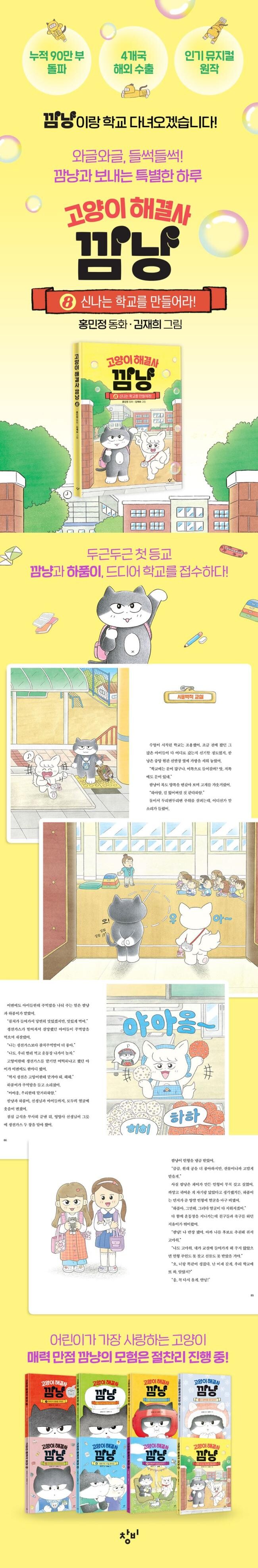 도도하면서도 매력 넘치는 고양이 ‘깜냥’은 지금까지 아파트, 피자 가게, 태권도장, 눈썰매장, 편의점, 동물병원, 캠핑장 등 어린이에게 친숙한 장소를 누비며 기발한 아이디어로 여러 문제를 해결해 왔다. 5권부터 함께한 고양이 ‘하품이’와의 ‘찰떡 호흡’은 이번 8권에서도 이어진다. 유쾌한 고양이 콤비가 새롭게 활약하는 곳은 바로 초등학교다. 학교는 어린이가 많은 시간을 보내는 장소이자 주요한 배움터로, 2020년 시리즈의 첫 권이 출간된 후 수많은 어린이 독자들이 홍민정 작가에게 가장 많이 추천한 깜냥의 다음 행선지이기에 더욱 의미가 깊다. 등교하는 아이들을 보며 학교가 어떤 곳인지 궁금해하던 깜냥과 하품이는 학교 근처에서 주운 토끼 인형의 주인을 찾아 주기 위해 무작정 학교 안으로 들어간다. 두 고양이는 반장 선거에 도전하는 아이를 응원하고, 뜀틀을 무서워하는 아이들 앞에서 멋진 시범을 보이며 용기를 북돋운다. 급식 시간에는 배식을 돕다가 실수를 저지르지만 이내 기지를 발휘해 아이들에게 맛있는 점심을 만들어 준다. 방과 후 교실에서 특별 활동까지 해내며 다채로운 하루를 보낸 깜냥과 하품이는 교문을 나서면서 진정한 우정의 의미를 되새기기도 한다. 학교의 이곳저곳을 누비며 아이들에게 웃음과 용기를 선사하는 깜냥과 하품이의 이야기를 따라가다 보면 어린이 독자들도 마치 학교를 여행하는 듯한 설렘과 기쁨을 느끼게 될 것이다.