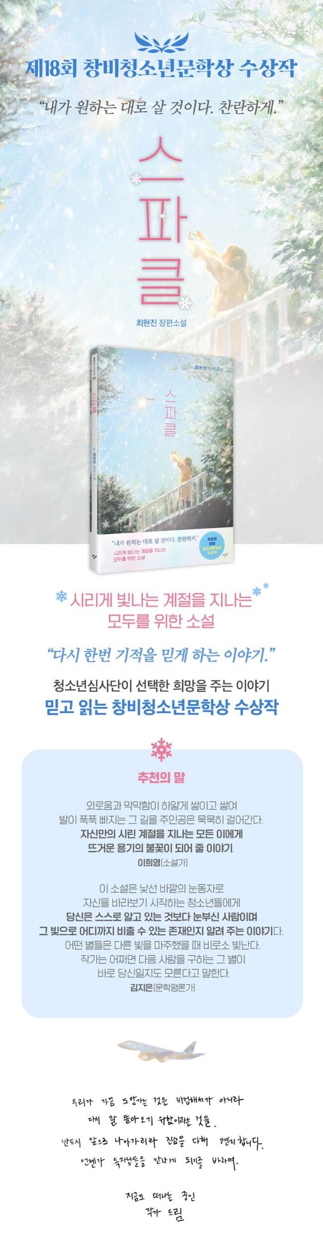 『스파클』은 뜬구름 잡는 상상력을 마음껏 펼쳐 보라고, 그 무한한 가능성으로 멋지게 비상하라고 말한다. 그 자유로움이야말로 누군가가 그토록 원했던 삶이었을 테니까……. 자신만의 시린 계절을 지나는 모든 이에게 『스파클』은 분명 뜨거운 용기의 불꽃이 되어 줄 것이다. 이희영(소설가)