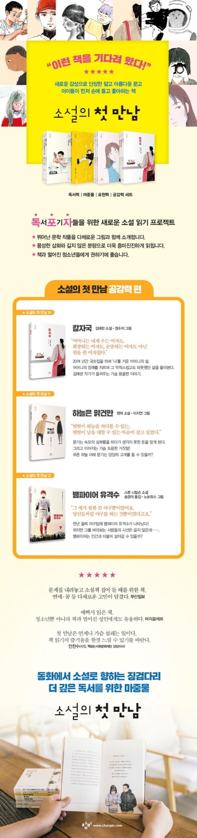 소설 『칼자국』은 좋든 싫든 함께 먹고 함께 잠들며 아름다운 문신 혹은 지울 수 없는 상처처럼 남는 가족의 의미에 관해 생각하게 한다. 우리 모두에게 어머니는, 가족은 어떤 의미로 기억될까? 『칼자국』은 김애란 작가의 자전적 이야기로 알려지며 널리 사랑받아 온 작품이다. 청소년의 눈높이에 맞춘 ‘소설의 첫 만남’ 시리즈로 다시 한번 소개하며, 청소년 독자들도 동시대의 좋은 작품에 가까이 다가설 수 있으리라 기대한다. 청소년들에게도 가족은 떼려야 뗄 수 없는 존재이기에, 다채로운 그림과 함께 만나는 이 소설이 더욱 특별한 의미로 다가갈 것이다.