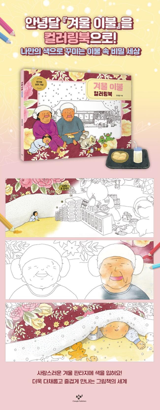 안녕달 작가의 그림책 『겨울 이불』을 원작으로 하는 『겨울 이불 컬러링북』이 출시되었다. 원작의 디테일을 고스란히 살린 라인 그림은 작품 속 요소를 하나하나 새롭게 들여다보게끔 한다. 주로 색연필로 채색하는 안녕달 작가의 그림은 색칠용 그림으로 특히 적합하다. 그림책을 참고해서 혹은 자유롭게 상상하며 놀라운 판타지 세계에 나만의 색을 더할 수 있다. 본 책에는 『겨울 이불』의 본문 그림 중 60여 컷을 선별해 표지 그림과 함께 수록하였는데, 누구나 쉽게 색칠할 수 있도록 그림 컷의 구성과 크기를 조정하여 색다른 재미를 선사한다. 또한 중간중간 그림책에 등장한 인상적인 대사를 삽입해 원작을 재미있게 읽은 독자가 그 감흥을 되새기며 간직할 수 있도록 했다. 어린이가 아늑한 공간에서 할머니, 할아버지 그리고 동물들과 다 함께 어울리는 장면들이 훈훈한 온기를 전한다. 『겨울 이불 컬러링북』과 함께라면 올겨울을 포근하게 보낼 수 있으리라 기대한다.
