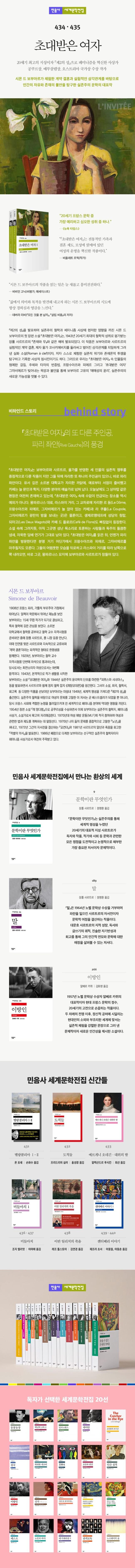 『제2의 성』을 발표하며 실존주의 철학과 페미니즘 사상에 현저한 영향을 끼친 시몬 드 보부아르의 첫 장편 소설 『초대받은 여자』가 민음사 세계문학전집으로 출간되었다. 1943년, 실존주의의 경전이자 20세기 최대의 철학적 성취로 평가받는 장폴 사르트르의 『존재와 무』와 같은 해에 발표된 이 작품은 실험적인 계약 결혼, 사르트르와 제자 올가 코사키에비치를 둘러싸고 빚어진 삼각관계를 잔인할 정도로 솔직하게 그려 낸, 일종의 실화 소설(Roman a clef)로서 크게 주목받았다. 그러나 오직 실화(삼각연애의 진상)에 입각해서 『초대받은 여자』를 독해한다면 자칫 이 작품이 지닌 깊이를 간과할 수 있다.