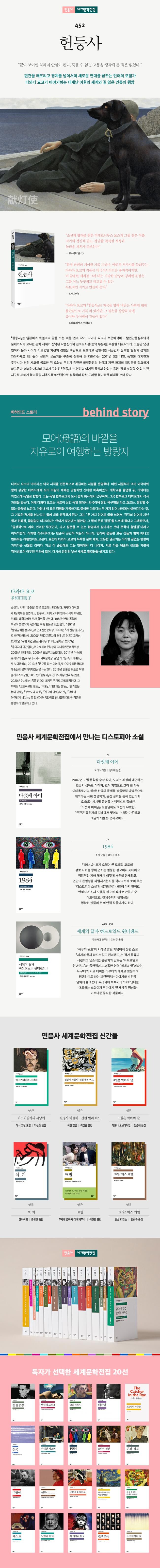 『헌등사』는 일본어와 독일어로 글을 쓰는 이중 언어 작가, 다와다 요코의 초문화적이고 탈인간중심주의적 문제의식과 고유한 문학 세계가 집약된 작품집이자, 전미도서상(번역 부문)을 수상한 대표작이다. 그동안 낯선 언어와 문화 사이에 가로놓인 자신의 경험을 바탕으로 모호하고 몽환적인 시공간과 잔혹한 현실의 경계를 자유자재로 월경(越境)하며 실험적 글쓰기를 꾸준히 실천해 온 다와다는, 2011년 3월 11일, 동일본 대지진과 후쿠시마 원전 사고를 목도한 뒤 오늘날 우리가 직면한 물질문명의 허상과 자연 파괴의 대갚음을 집요하게 파고든다. 이러한 저자의 고뇌가 구현된 『헌등사』는 인간의 이기적 욕심과 한없는 욕망, 감히 저항할 수 없는 전 지구적 재해가 불러들일 지옥도를 예언적으로 성찰하며 장차 도래할 불가해한 미래를 보여 준다. 그러나 다와다 요코는 단지 ‘디스토피아’를 구현하는 데에 그치지 않고, 절망을 희망으로 이끄는, 어둠에 잠식된 비관적 세계에 등불을 밝히고자 미지의 영역으로 도도히 나아가는 ‘헌등사’를 통해 언어와 문화의 차이, 인간과 자연의 불화를 통합해 내는 비전(vision)을 제시한다. 더불어 플롯을 압도하는 “이야기의 추진력”과 “일종의 퍼포먼스”처럼 보이는 독창적인 언어유희는 절정에 이른 작가의 역량을 유감없이 드러낸다.