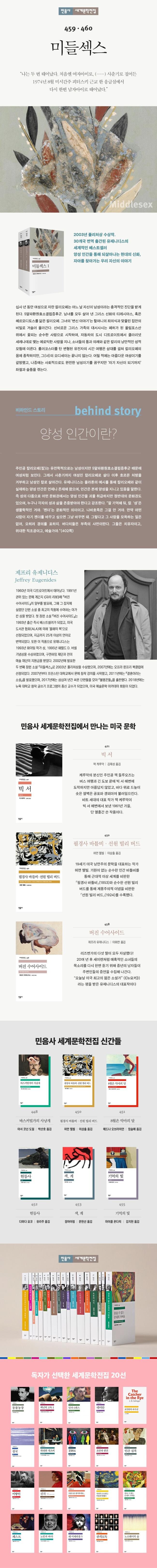“오늘날 미국 최고의 젊은 소설가”(《뉴요커》)라는 평을 받은 제프리 유제니디스의 2003년 퓰리처상 수상작 『미들섹스』가 민음사 세계문학전집으로 출간되었다. ‘미들섹스’라는 제목은 성 정체성의 혼란뿐 아니라 전통과 현대 과학, 구세대와 신세대, 주류와 비주류 사이의 혼란을 암시한다. 유제니디스는 1960년 미국 미시간주 디트로이트에서 태어나 그리스계 미국인 가정에서 자랐다. 가족의 이민자 경험과 문화적 정체성은 그의 작품 세계에 큰 영향을 미쳤으며, 이는 『미들섹스』에서 특히 두드러진다. 2003년 퓰리처상 수상작으로 선정되어 그에게 세계적인 명성을 안겨 준 이 작품에서, 그는 성 정체성과 가족사를 중심으로 하여 공간적으로는 고대 문명의 발생지인 그리스로부터 신대륙 미국까지, 시간적으로는 삼대에 걸친 방대한 서사를 전개한다. 주인공 칼리오페는 남자와 여자를 모두 아우른 인류를 상징하며, 서양 문명의 근간을 이루는 그리스에 뿌리를 두면서, 동시에 오늘날 인류 문명의 중심인 미국을 본거지로 살아가는 ‘미들-문화’, ‘미들-인류’적인 인물이다. 약자와 소수에 대한 따듯한 시선, 차이가 받아들여지는 세상을 꿈꾸는 칼리오페의 감동적인 이야기인 『미들섹스』는 성과 젠더를 포함하여 근친 결혼, 인종 차별, 약소 민족, 사회생물학적 결정론 등 현대 사회의 쟁점을 독창적으로 다룬 보기 드문 문제작이다.