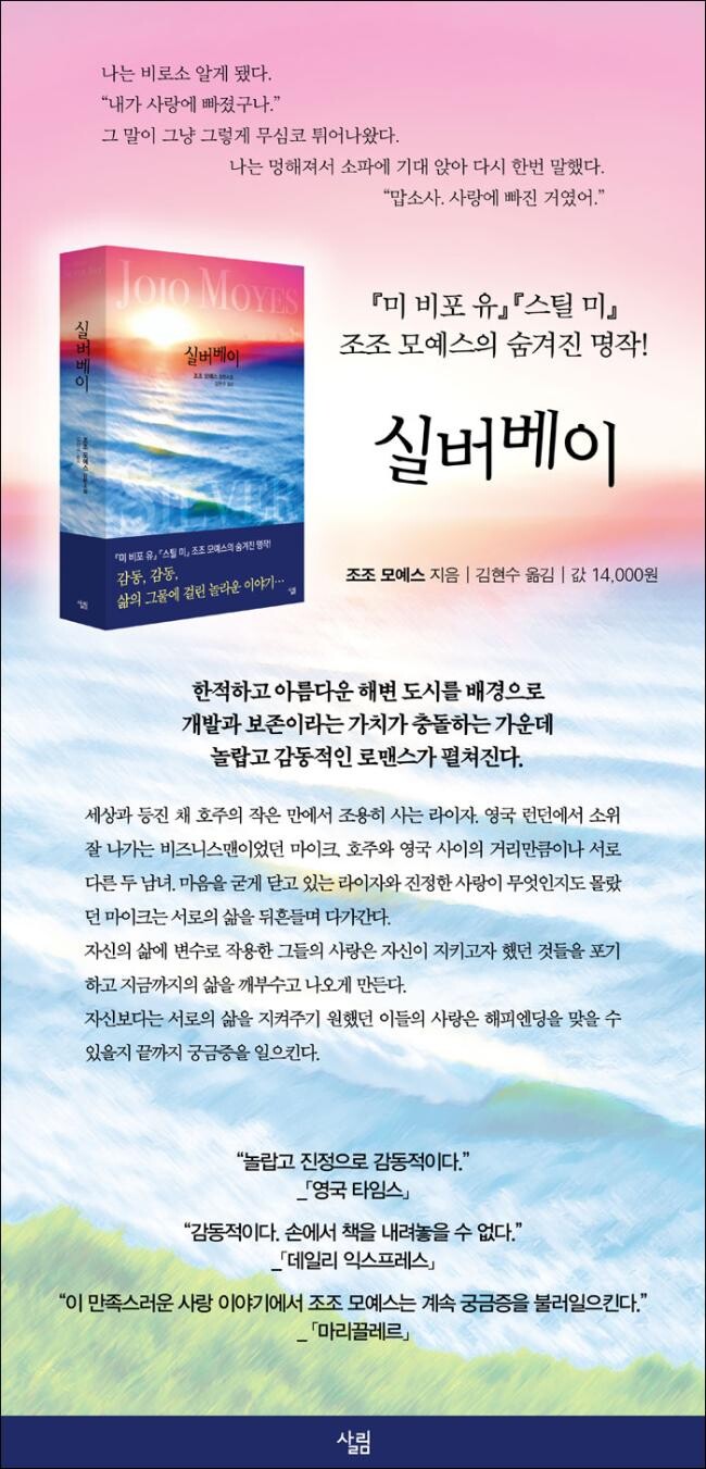 『미 비포 유』가 ‘존엄사’라는 무거운 주제를 대중성 있게 담아냈다면, 『미 비포 유』의 마지막 이야기인 『스틸 미』는 삶을 새롭게 시작하는 주인공을 통해 ‘삶의 주체성’을 다룬 의미 있는 작품이었다. 『실버베이』 역시 조조 모예스 특유의 쉽게 읽히는 문체와 가볍고 톡톡 튀는 대사로 이루어져 있으면서도, ‘환경과 개발의 대립’을 보여주면서 다시 한 번 생각하게 만든다는 점에서 의미 있는 작품이다. 실버베이를 지키려는 라이자와 개발을 성사시키기 위해 영국에서 온 마이크가 서로에게 다가가며 생기는 변화가 예기치 못한 방향으로 흘러간다. 그리고 삶의 키를 잡고 있는 자신의 손이 모든 것을 조정할 수는 없다는 걸 깨닫게 된다.