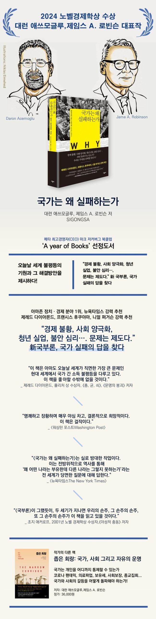 이 책은 최근 주목받고 있는 젊은 학자이자 MIT의 경제학과 교수 대런 애쓰모글루와 하버드대학교의 정치학과 교수 제임스 A. 로빈슨이 함께 쓴 책으로 ‘왜 그토록 여러 나라가 발전하지 못하는지’ 더 나아가 오늘날 ‘번영과 빈곤, 세계 불평등의 기원은 어디에 있는지’ 간단하면서도 설득력 있는 설명을 내놓는다.