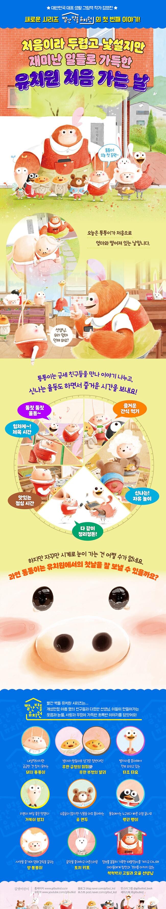 친구들, 선생님과 인사를 하는 시간, 간식 시간, 교실에 있는 다양한 장난감, 교구를 자유롭게 가지고 노는 시간, 정리 정돈 시간, 다양한 인원으로 나누어 율동도 배우고 이야기도 나누는 대·소집단활동, 체육 활동이 주가 되는 바깥 놀이 및 대근육 활동, 점심 식사, 평가 까지 실제 유치원의 하루 일과를 ‘빨간 벽돌 유치원’ 시리즈로 미리 만나 보세요. 조금은 불안하고 두려운 마음으로 첫발을 내딛을 아이들에게 작지만 커다란 용기를 북돋아 주게 될 거예요.
