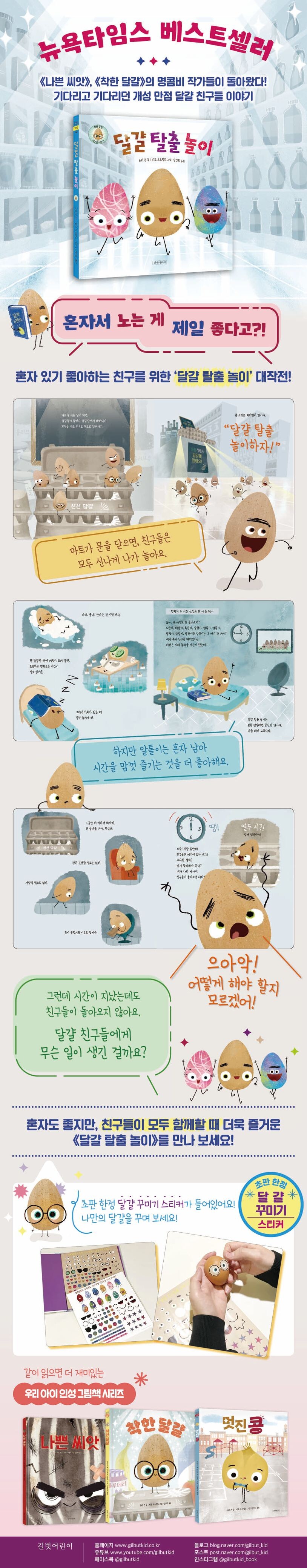 뉴욕타임스 베스트셀러 그림책 《착한 달걀》에 등장했던 개성 만점 달걀 친구들이 《달걀 탈출 놀이》로 돌아왔습니다! 마트가 열지 않는 일요일이면, 모두 함께 ‘달걀 탈출 놀이’를 하는 달걀 친구들과 혼자 있기 좋아하는 달걀 알톨이의 이야기를 담았어요. 커다란 달걀판에 혼자 남아 책을 보고, 목욕을 하는 등 자신만의 시간을 즐기는 알톨이와 마트 이곳저곳을 뛰어다니며 신나게 노는 달걀 친구들의 모습은 유쾌하고 즐거워요. 혼자도 좋지만, 친구들이 모두 함께할 때 더욱 즐거운 《달걀 탈출 놀이》를 만나 보세요!