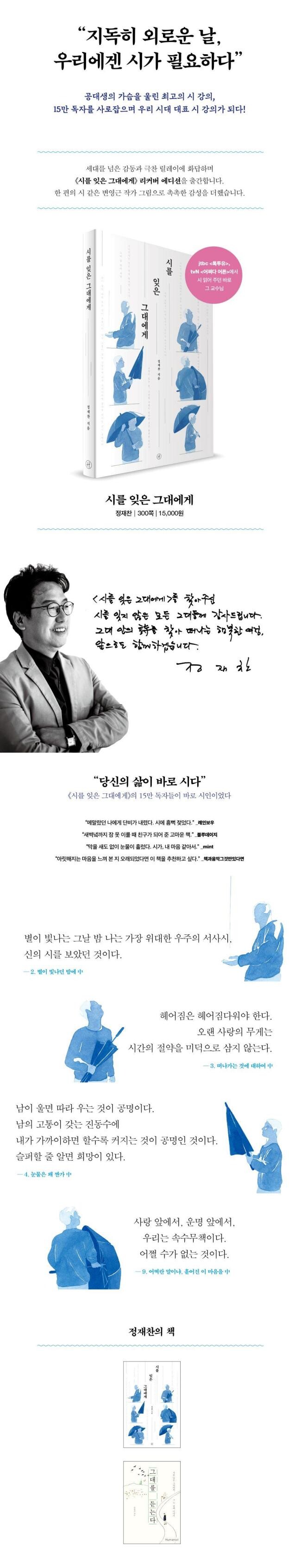 “눈물이 고일 정도로 감동받고, 소름 끼칠 정도로 감탄했다!”그저 입시를 위해 문학 참고서로 시를 배워 온 당신. 껍데기는 가라고 사람만이 희망이라고 아무리 외쳐 봐야, 내 몸 뉘일 방 한 칸 없고, 열정을 불사르겠다는데도 부르는 곳은 없으며, 부장님은 퇴근 무렵 보고서를 내던지고, 오늘밤에도 월급은 통장을 스치운다. 그래도 우리 마음만은 가난하지 말자고, 〈죽은 시인의 사회〉 속 키팅 교수를 꿈꾸며 메마른 심장의 상징 공대생들과 함께 시를 읽기 시작한 사람이 있다. 한양대학교 국어교육학과 정재찬 교수는 때로는 지나간 유행가를 흥얼거리고, 때로는 누군가의 추억이 된 영화를 보고, 때로는 어떤 말보다 가슴을 후비는 욕 한 마디를 시 구절에 덧붙이면서 우리 시대를 풍미한 최고의 현대시들을 학생들과 함께 읽었다. 그렇게 낡은 교과서 속 시 지문은 공대생마저 눈물짓게 할 가슴을 적시는 불후의 명시로 되살아났다. 한 번쯤 그렁그렁 가슴에 고인 그리움이 왈칵 쏟아지는 그 순간, 시는 찾아오고, 청춘은 다시 시작된다. 기쁜 우리 젊은 날 좌절한 그대여, 지금은 바로 진짜 시를 만날 시간이다.이제 감히, 대학 입시 때문에 지금도 억지로 시를 공부하고 있는 학생이든, 시를 향유하는 자리에서 소외된 노동하는 청년이든, 심야 라디오에 귀 기울이며 시를 읊곤 하던 한때의 문학소녀든, 시라면 짐짓 모르쇠요 겉으로는 내 나이가 어떠냐 하면서도 속으로는 눈물 훔치는 중년의 어버이든, 아니 시라고는 당최 가까이 해 본 적 없는 그 누구든, 시를 잊은 이 땅의 모든 그대와 함께 나누고파 이렇게 책으로 펴냅니다.-〈머리말〉 중에서1. 공대생을 위한 현대시 명강의- 한양대학교 국어교육학과 정재찬 교수의 오감만족 현대시 강의대학교의 한 강의실, 학생들은 무언가에 홀린 듯한 표정으로 눈물짓다가, 탄식하다가, 깔깔깔 웃는다. 그리고 강의의 끝을 알리자 모두가 약속이라도 한 듯 뜨거운 박수를 보낸다. 이는 영화 속의 한 장면이 아니다. 바로 대학의 시 강의에서 벌어진 장면이다. 보통의 중·고등학교 학생들은 마치 ‘종교적 제의’와 같은 문학 시간을 거치며 문학에 완전히 흥미를 잃는다. 교사는 마치 제사장처럼 경전을 대하듯이 주석을 덧붙이며 시를 읽고, 학생들은 그 주석을 열심히 받아 적고 암송하면서 시의 낭만과 아름다움과 진실 들에서 점점 더 멀어져 간다. 그렇게 학교를 졸업하고 나면 시가 무어고 소설이 무언지 까맣게 잊고 먹고사는 데 급급해질 뿐이다. 아니, 어쩌면 우리는 제대로 시를 읽은 적이 없을지도 모른다.한양대학교 국어교육학과의 정재찬 교수는 이러한 우리 문학 교실에 대한 문제의식을 바탕으로 교양 강좌 ‘문화혼융의 시 읽기’를 개설했다. 이 수업에는 주로 문과대학생보다는 공대, 의대, 법대, 경영대 등 시와는 거리를 두고 지내온 학생들이 대부분. 무엇이든 공식이나 수치로 답하길 즐겨 하는 ‘메마른 심장의 상징’ 공대생들에게 시를 읽히는 과정은 마치 초등학생에게 미적분을 가르치는 것처럼 어려웠다. 《시를 잊은 그대에게》는 이러한 공대생들마저 눈물짓게 한 정재찬 교수의 시 읽기 명강의를 엮어 낸 책이다.《시를 잊은 그대에게》는 한양대학교의 문·이과 통합 교육의 일환인 ‘융복합 교양 강좌’ 중 이공계 학생들을 대상으로 한 시 읽기 강좌, 정재찬 교수의 ‘문화 혼융의 시 읽기’ 강의의 내용을 바탕으로 집필한 ‘시 에세이’다. 각종 스펙 쌓기와 취업에만 몰두하느라 마음마저 가난해져 버린 학생들에게 시 읽는 즐거움을 오롯이 돌려주고자 했던 정재찬 교수의 ‘문화 혼융의 시 읽기’ 강의는 매 강의마다 학생들의 박수갈채를 받으며 한양대 최고의 교양강의로 선정되었다. 어떤 특별함 때문이었을까?사실 이 책에서 다룬 46편의 시는 우리에게 매우 친숙한 작품들이다. 중·고등학교 문학 교과서에서 한 번 쯤 보았던 한국의 근·현대시들이 대부분이기 때문이다. “눈은 살아 있다”의 ‘눈’은 오로지 ‘순수’의 상징이라고 읽고, 김소월의 시는 무조건 식민지 지식인의 정한이라고 해석해온 그런 시들 말이다. 신경림의 〈갈대〉, 윤동주의 〈별 헤는 밤〉, 김춘수 〈꽃〉 등 교과서에서 클리세Cliche처럼 읽히던, 그러나 지금까지도 한국 최고로 손꼽히는 시들을 동시대인의 삶 속에 생생하게 되살리기 위해 강연에는 각종 영화와 소설, 유행가와 가곡, 그림과 사진 등 다양한 문화콘텐츠들이 동원되었다. 소리와 영상뿐 아니라, 후각과 촉각을 모두 동원한 특별한 시 읽기였다.이 책은 평론의 언어를 그대로 답습하여 문학으로부터 독자를 소외시키고 마는 우리 문학교육의 엄숙주의를 날카롭게 비판하며, 마치 축제를 즐기듯 문학을 향유하는 방법을 일러 주고자 한다. 문학작품을 많이 아는 것보다 진짜 좋아하는 시 한 작품이 있어야 스스로 작품을 찾아 읽고 즐길 수 있다는 믿음에서다. “문학교육이 잘 살아서 문학 역시 더 잘 사는 관계로 만들고 싶었다(인터뷰 중)”는 정재찬 교수는 몇 차례의 강의를 통해 학생들이 다양한 장르의 콘텐츠를 활용하여 자신의 일상을 시와 함께 읽고 쓰는 힘을 기를 수 있는 교