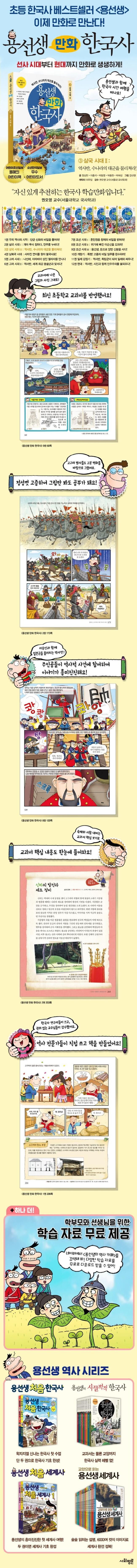 초등학교부터 한국사 교육이 강조되고 있는 요즘, 초등학생 자녀를 둔 학부모의 걱정은 이만저만 큰 것이 아니다. 어떤 책으로 한국사 공부를 시작해야 할지, 한국사 입문용으로 만화책을 읽혀도 될지, 믿을 수 있는 전문가가 쓴 책인지, 아이가 책을 읽다가 재미없다고 내팽개치지는 않을지……. 이런 고민을 해결하기 위해 용선생이 나섰다! 초등 한국사 부동의 1위! 100만 독자가 선택한 《용선생의 시끌벅적 한국사》의 전면개정판에 이어 한국사 학습 만화 《용선생 만화 한국사》가 출간됐다.