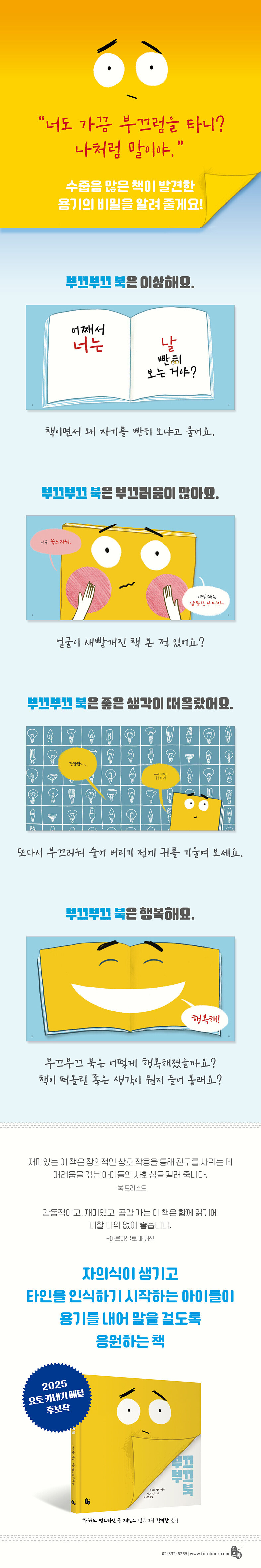 페이지를 넘길 때마다 부끄부끄 북의 감정은 계속 요동쳐요. 부끄러워하면서도 끊임없이 말을 걸고, 잘 가라는 인사에도 불구하고 떠나지 않은 것을 확인하고 안도해요. 어렵게 속마음을 털어놓고는 일어나지 않은 상황을 떠올리고 두려워해요. 그래서 자기 대신 다른 책을 읽으라며 마음에도 없는 소리를 늘어놓기도 하죠.