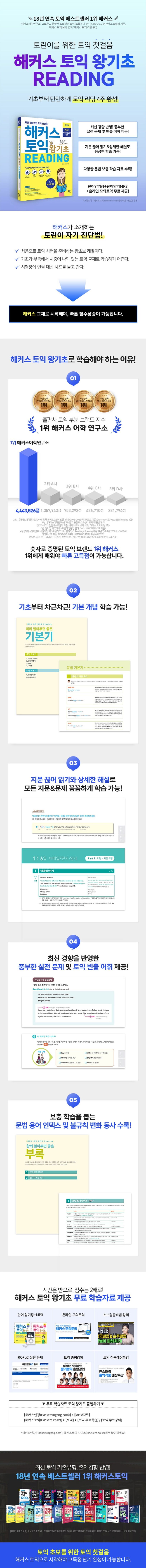 1) 영어 문법 및 구문 독해의 기본 개념이 정리된 '기본기 코너'와 '기초부터 차근차근' 코너를 통해 토익 리딩의 기초를 탄탄하게 다질 수 있음