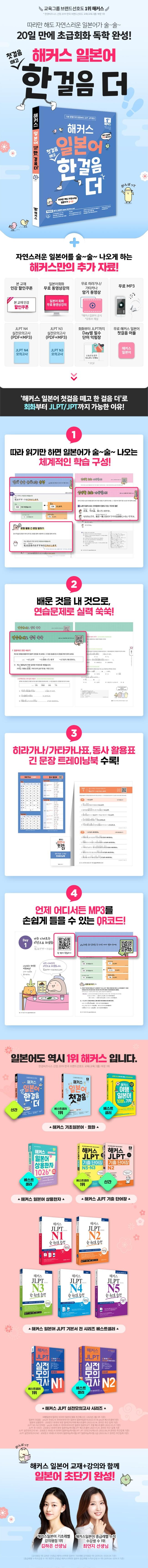 - 교재의 앞날개에 있는 '히라가나/가타카나표', 교재의 뒷날개에 있는 '동사 활용표'로 기초를 더욱 튼튼히 다지고 학습을 시작할 수 있습니다.