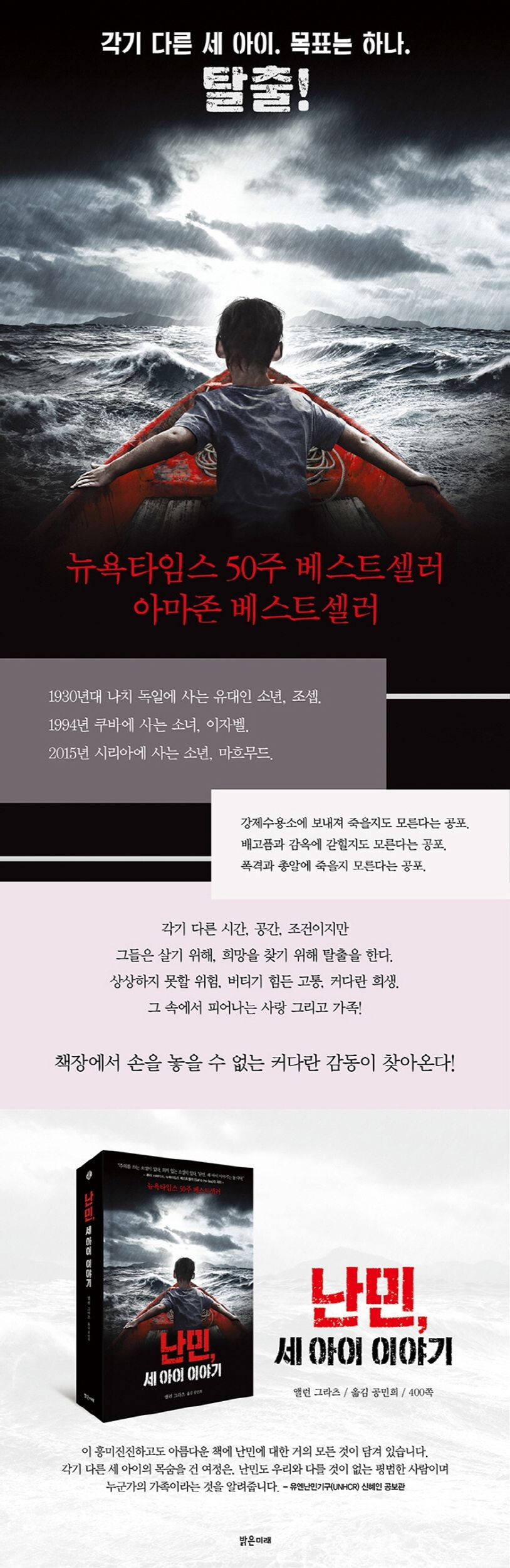 <난민, 세 아이 이야기>는 사실을 기반에 두고 쓰여 졌지만 허구의 이야기이다. 그럼에도 이 책의 가장 큰 미덕은 몰입감이며 공감이다. 책장을 넘기며 읽다 보면 ‘난민이 누구인지?’, ‘난민들이 왜 난민이 되어야 하는지?’, ‘그들이 어떤 마음으로 탈출을 하고 피난처를 찾고 있는지?’ 하는 질문에 대한 대답을 머리로 하는 게 아니라 가슴으로 느끼게 한다. 다른 시대, 다른 공간, 다른 환경 속에서 벌어진 세 아이의 다른 이야기가 하나로 이어지면서 남기는 메시지는 난민 이야기를 남 얘기가 아닌 우리 이야기로 받아들이게 한다.