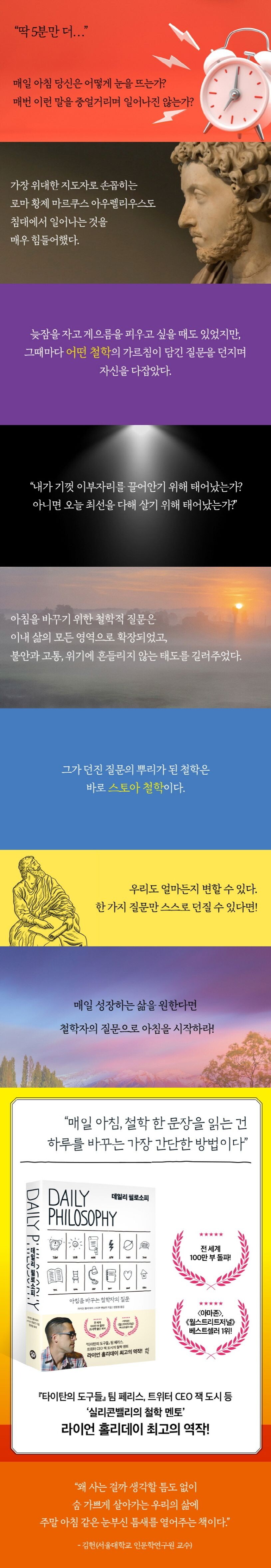 스토아 철학자들은 아침의 선구자이며 밤의 사제라고 불렸다. 그들은 일찍부터 삶을 준비했고, 저녁엔 사색에 잠겼다. 『데일리 필로소피』는 이들의 실천법에 영감을 받아 만들어졌다. 366일로 책이 구성된 것은 하루 한 번의 사색을 의미한다. 우리는 사색하는 시간을 통해 가장 먼저 삶의 목적과 방향을 찾아야 한다. 그래야만 내가 하고 싶은 일이 어떤 것인지, 내가 바꿀 수 있는 것과 없는 것이 무엇인지 알 수 있으며 시련이 닥쳐도 실망하거나 후회하며 주저앉는 대신 앞으로 나아갈 수 있다.