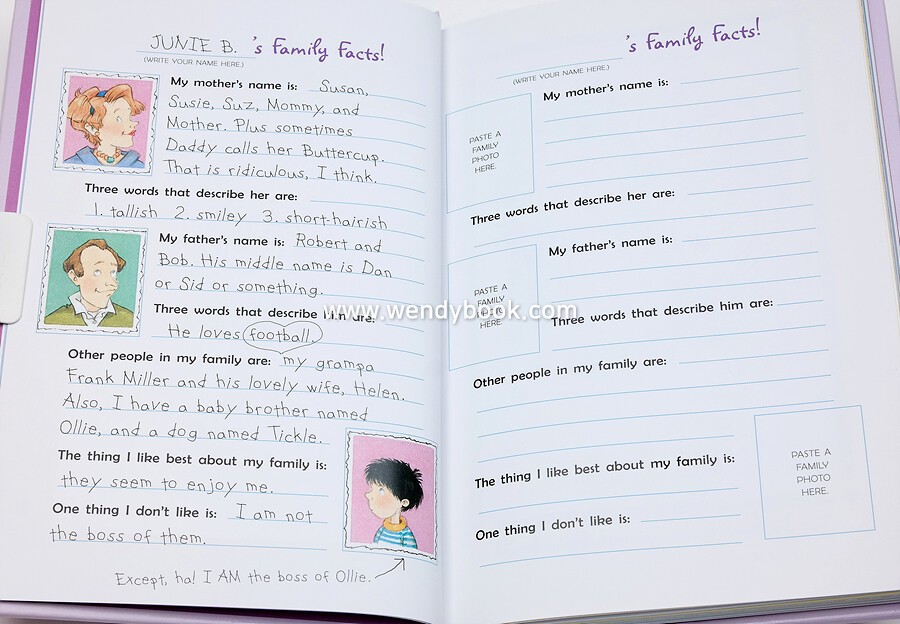 바바라 파크의 베스터셀러 주니 비 다이어리. 인적사항, 가족들, 친구들부터 시작해 좋아하는 것, 무서워하는 것 등 온갖 자질구레한 것들을 적을 수 있다. 특이한 것은, 각 항목의 왼쪽 페이지에는 주니 비의 것이 적혀 있고, 오른쪽에는 자기 자신의 것을 적을 수 있도록 비워져 있다는 것이다. 주니 비의 팬인 꼬마들에게는 더없는 선물이 될 듯.