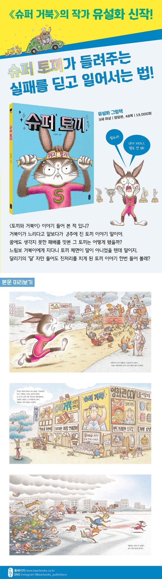 《슈퍼 토끼》는 실수나 실패에 대처하는 우리의 모습을 비추는 거울이나 다름없습니다. 부정하고, 분노하고, 체념하고, 예민하게 굴다가 급기야 회피하기까지 하는……. 그럼에도 그 모습을 끝까지 지켜보며 응원하게 되는 것은 작가의 따뜻한 시선과 유머 감각 때문이지 싶습니다. 재빨라의 감정 변화를 세심하면서도 재치 있게 그려내 공감과 웃음을 자아내는 솜씨도 그렇지만, 어린이들이 먼저 발견하고 즐거워할 만한 요소를 구석구석 숨겨 둔 배려도 감탄할 만합니다. 이를테면 《슈퍼 거북》에서 꾸물이의 입장에서 그려졌던 원전〈토끼와 거북이〉가 《슈퍼 토끼》에서는 재빨라의 입장에서 그려집니다. 작가의 여러 작품 속에서 재빨라의 ‘찐팬’으로 활약해 왔던 너구리의 새로운 행보도 담겨 있습니다(이 너구리는 어린이들이 작가의 책에서 가장 좋아하는 등장인물이라고 합니다.).