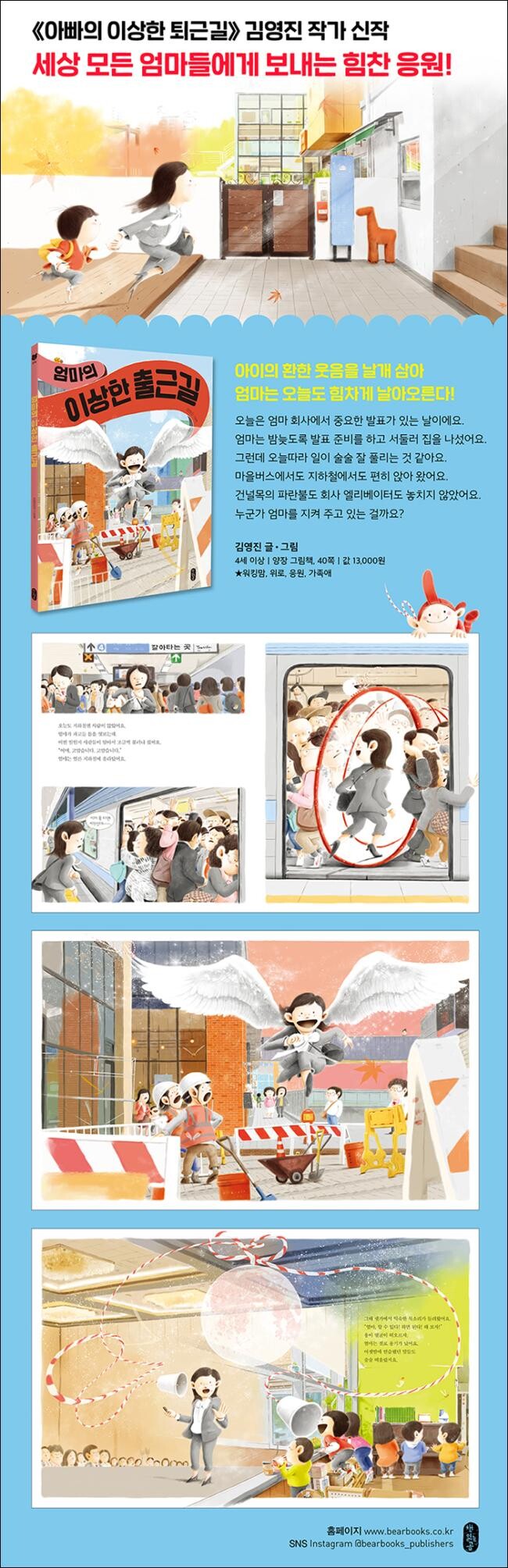 새 학기가 시작되면 어린이집이나 유치원 현관에서는 눈물 없이 볼 수 없는 광경이 펼쳐지곤 합니다. 좀처럼 떨어지지 않으려는 아이눈물바람와 억지로 떼어 놓으려는 엄마가 실랑이를 벌이다 끝내는 어느 한쪽이, 때로는 양쪽 모두 울음을 터트리는 광경이지요. 중요한 약속이라도 있는 날이면 옷자락을 붙잡고 늘어지는 아이의 손가락을 하나하나 힘주어 떼어 내고 돌아서서는 눈물을 삼키는 일도 적지 않습니다. 그런 날이면 묵직한 납덩이라도 얹은 듯 온종일 마음이 무겁습니다. 《엄마의 이상한 출근길》은 그런 엄마들의 마음을 다독이는 그림책입니다.