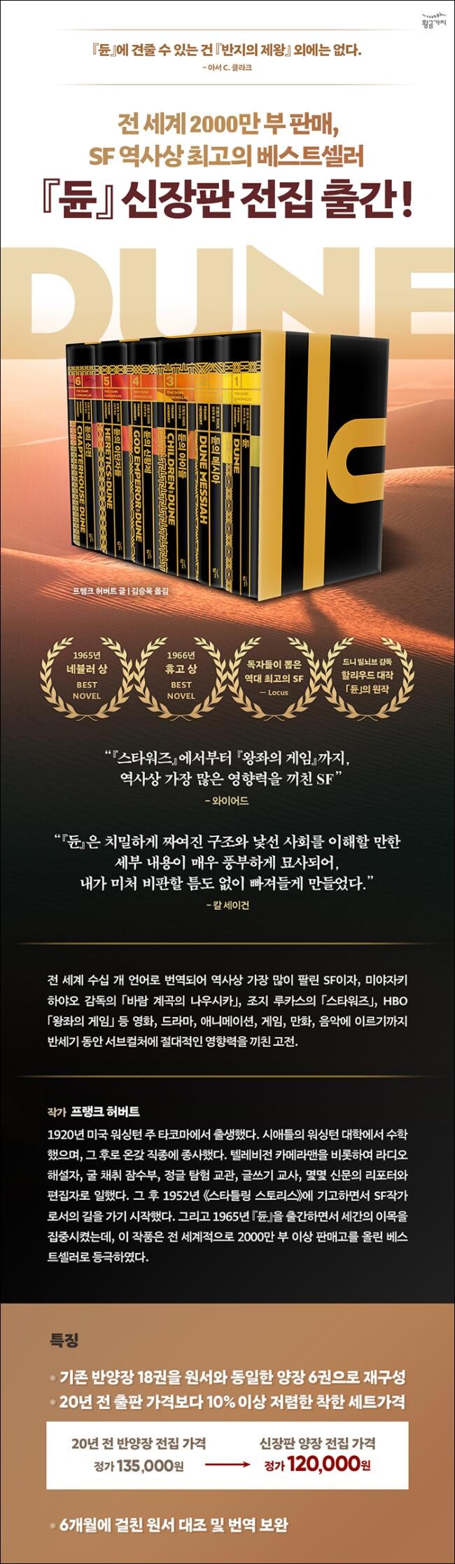 우주 시대 인류 역사가 담긴 『듄』 전집은 사막 행성인 '아라키스'를 배경으로, 철학, 인종, 종교, 정치, 문화, 역사 등을 모두 담아낸 대하 SF이다. 총 6부로 구성되어 있으며, 1부는 폴 아트레이데스를 주인공으로 하여 아트레이데스 가문이 황제와 하코넨 가문의 정략적인 함정에 빠져 몰락했다가 폴에 의해 복권되는 과정을 한국 출판본 기준으로 근 1000쪽에 이르는 장대한 분량으로 집필하였다. 2부는 전 우주의 왕좌에 올라선 폴과 그의 지배에 억눌렸던 다른 정치 세력들의 새로운 음모를 그리고, 3부는 폴의 자녀인 레토와 가니마를 주인공으로 하여, 아트레이데스 가문의 권력 투쟁 과정을, 4부에선 수천 년 동안 독재자로 군림하게 된 레토 아트레이데스와 저항 세력의 이야기를, 5부와 6부에선 황제 사후, 베네 게세리트와 명예의 어머니 사이에 벌어지는 치열한 싸움을 다루는 등 수천 년의 우주 역사를 상세히 담아낸다. 대표적인 SF 작가인 아서 클라크는 『듄』에 대하여 "이 작품에 견줄 수 있는 건 『반지의 제왕』뿐이다."라며 찬사를 보냈으며, 세계적인 천문학자 칼 세이건은 1978년 《뉴욕 타임스》에 SF에 관한 칼럼을 게재하며, "치밀하게 짜여진 구조와 낯선 사회를 이해할 만한 세부 내용이 매우 풍부하게 묘사되어, 내가 미처 비판할 틈도 없이 빠져들게 만들었다." 고 극찬하기도 하였다. 2009년에는 USGS(미국 지질조사국) 우주과학 센터에 의해 토성의 위성인 타이탄의 평원 등 각종 특징에 『듄』의 소설 속 행성 이름을 명명함으로써 화제가 되기도 하였다.