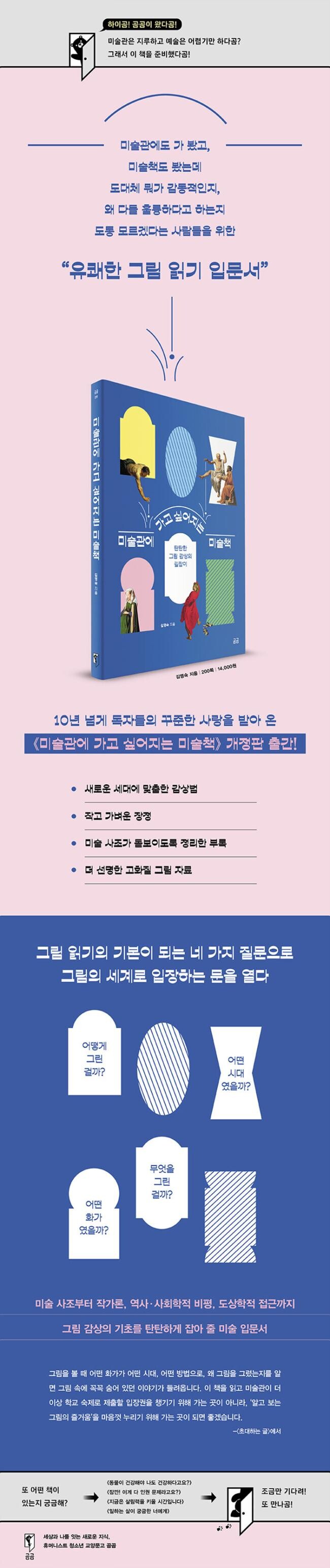 2009년 문화체육관광부 교양도서2010년 (사)행복한아침독서 추천도서1. 청소년을 위한 유쾌한 그림 읽기 입문서누구보다 쉽고 친근하게 그림을 소개하는 미술 이야기꾼 김영숙의 청소년을 위한 미술 입문서. 2009년 첫 출간된 후 10년 넘게 독자들의 꾸준한 사랑을 받아 온 《미술관에 가고 싶어지는 미술책》이 새롭게 개정되었다. 오늘날의 감수성에 맞게 내용을 수정하고, 일상에서 더 가까이 그림을 만날 수 있도록 한 손에 쏙 들어오는 작고 가벼운 장정으로 제작했다.《미술관에 가고 싶어지는 미술책》은 미술관에도 가봤고, 미술책도 봤는데, 도대체 뭐가 감동적인지, 왜 다들 훌륭하다고 하는지 도통 모르겠다는 사람들을 위한 유쾌한 그림 읽기 입문서다. 저자는 독자들의 열렬한 호응을 받아 온 특유의 글맛으로 그림의 세계를 흥미진진하게 안내한다. 그림 감상에 반드시 많은 지식이 필요한 것은 아니다. 하지만 알고 보는 그림과 그냥 보는 그림은 천양지차다. 그럼 그림의 세계로 입장하기 위해 꼭 알아야 할 최소한의 지식은 뭘까?《미술관에 가고 싶어지는 미술책》은 그림 속에 꼭꼭 숨겨진 이야기를 풀어내는 비밀의 주문 네 가지를 알려 준다. 바로 ‘어떻게 그린 걸까?’ ‘어떤 시대였을까?’ ‘어떤 화가였을까?’ ‘무엇을 그린 걸까?’라는 질문이다. 무작정 미술관에 따라가 아무런 준비 없이 그림 앞에 서면, 어떤 그림을 봐도 별다른 느낌을 받기 어렵다. 저자는 “사람이든 그림이든 그냥 쓱 훑어보는 것과 관심을 가지고 보는 것에는 큰 차이가 있다”고 말한다. ‘왜 하필 이 장면을, 이런 색감을 사용해서 그린 걸까?’ ‘화가는 어떤 삶을 살았던 걸까?’ 그림 앞에 서서 질문을 던져보자. 그림이 천천히 나에게 이야기를 들려주기 시작할 것이다.지금껏 그림과 즐겁게 혹은 진지하게 만나볼 기회가 없었던 어린이부터 청소년, 성인에 이르기까지, 이 책은 그림 감상을 위한 기본 포인트와 부담 없는 지식으로 그림과 소통하는 길을 열어주고, 그림이 즐거워지는 유쾌한 첫 경험을 선사한다.그림을 볼 때 어떤 화가가 어떤 시대, 어떤 방법으로, 왜 그림을 그렸는지를 알면 그림 속에 꼭꼭 숨어 있던 이야기가 들려옵니다. 그냥 눈으로 스치듯 보는 것이 아니라, ‘그림 속 이야기’를 알고 보면 그림이 다르게 보입니다. 이 책을 읽고 미술관이 더 이상 학교 숙제로 제출할 입장권을 챙기기 위해 가는 곳이 아니라, ‘알고 보는 그림의 즐거움’을 마음껏 누리기 위해 가는 곳이 되면 좋겠습니다.-〈초대하는 글〉에서2. 그림과 소통하는 네 가지 방법《미술관에 가고 싶어지는 미술책》은 그림을 보는 가장 기본적인 네 가지 질문에 따라 구성되어 있다. 1부는 그림을 그린 방식, 즉 미술 사조를 통해 그림을 이해하는 방법을 알려 준다. 남다른 시각으로 세상을 보고, 독창적인 방법으로 그림을 그리고자 한 화가들이 어떻게 새로운 미술 사조를 창조해 나갔는지 소개한다. 르네상스, 바로크, 인상주의……. 미술책을 펼쳤을 때 자주 접하게 되는 미술 사조이지만 매번 어렵게만 느껴진다. 하지만 변화를 추구한 색다른 눈을 가진 화가들을 통해 미술 사조를 읽으면 르네상스, 매너리즘, 바로크, 로코코에 이은 19세기 신고전주의와 낭만주의, 사실주의와 인상주의, 큐비즘, 추상주의까지 흐름이 보인다. 또한 미술 양식의 변화와 시대마다 아름다움이라는 기준이 어떻게 흘러왔는지를 알 수 있다.2부는 사회학적 방법으로, 그림 속 시대 상황을 통해 그림 읽는 방법을 알려 준다. 올바른 삶, 행복한 삶을 방해하는 것들에 그림으로 저항한 화가들의 이야기를 통해 그 시대에 어떤 역사적 사건이 있었는지, 화가가 자신의 목소리를 어떤 방식으로 그림에 담았는지 살펴본다. 왕실 전속 화가로 풍족한 삶을 누릴 수 있었지만, 세상의 어두운 면을 외면하지 않고 사회비판적인 그림을 그린 고야, 가난한 농부를 그림의 주인공으로 세운 밀레 등 힘없는 사람들이 고통받는 부조리한 세상을 바꾸고자 한 열정적 화가들의 이야기와 그들의 그림은 지금 이 세상을 보는 또 하나의 창이 되기도 한다.고야는 왕실의 전속 화가로 있으며 시키는 대로 그림이나 그리고 살아도 충분히 편안하게 지낼 수 있었을 것이다. 그러나 그는 자신이 속한 세상에 대한 관심과 애정을 한 번도 놓은 적이 없었다. 고야는 말년에 검은색으로만 이루어진 그림을 그리면서 세상을 어둡게 하는 인간들의 검은 마음을 표현하기도 했다. 고야는 세상의 폭력과 어리석음을 고발하는 그림을 많이 발표함으로써 (…) 진실의 소리는 외면했던 어리석은 사람들에게 그림을 통해서 ‘깨어나라’고 외쳤다.-〈밉살스럽고 못난 왕을 그리다_프란시스코 데 고야〉 중에서(99쪽)3부는 작가론적 접근법으로, 화가의 개인사와 심리를 통해 그림을 읽는 방법이다. 유난히 아프고 힘겹게 살아간 화가들의 무의식과 욕망, 갈등, 충동을 이해해 그림을 보는 방법이다. 생전에는 세상의 인정을 받지 못해 외롭고 괴롭게 살았던 고흐와 더불어 김정희, 구본웅, 이중섭 등 한국 화가들의 작품 세계도 만나 볼 수 있다. 그냥 보면 잘 그린 혹은 조금 특이한 그림에 불