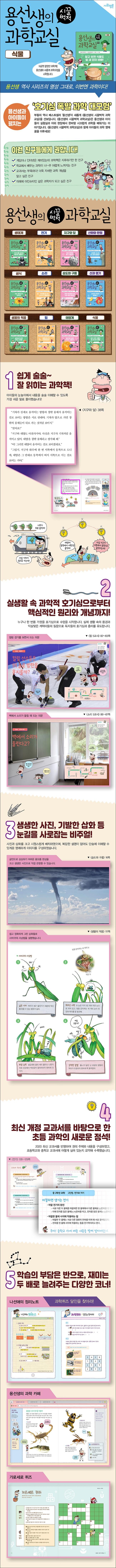 부동의 역사 베스트셀러 ‘용선생’이 새롭게 《용선생의 시끌벅적 과학교실》을 선보입니다. 《용선생의 시끌벅적 과학교실》은 용선생과 아이들이 한바탕 시끄럽게 과학을 배워 가는 이야기입니다. 현재 아이들의 독서 습관을 고려한 쉬운 서술, 생생한 사진과 기발한 삽화로 눈길을 사로잡는 비주얼, 2020년 최신 과학 교과서를 충실히 반영한 내용 구성, 호기심을 북돋우는 소재로 풀어낸 개념과 원리 등 초등학생이 꼭 알아야 할 과학의 모든 것이 담겨 있습니다.