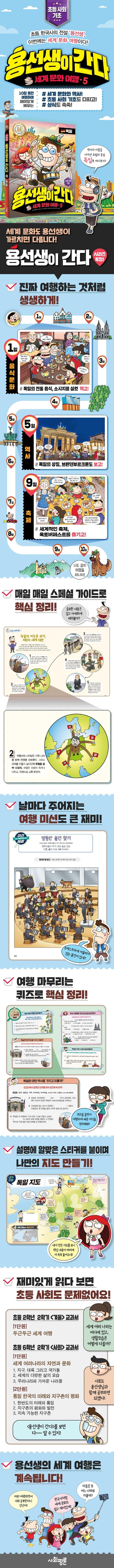 코너가 그때그때 해결합니다. 여기에 더 알고 싶은 정보가 있다면? 매일매일 여행이 끝날 때마다 주어지는 <용선생의 스페셜 가이드>에서는 어른들도 잘 몰랐던 깊이 있는 정보까지 빠짐없이 전달해 드립니다. 혹시 책만 읽기 지루해 하는 아이가 있다면? 스페셜 가이드가 끝난 후 주어지는 <미션 해결! 지금 여행지에서는...?> 코너에서 숨은 그림 찾기나 미로 찾기, 추리하기 등 어린이들이 좋아하는 다양한 독후 활동을 제공합니다. 술술 읽다보면 머릿속에는 상식이 쌓이고 입가에는 미소가 그치지 않는 최고의 세계 여행을 경험하게 될 것입니다.