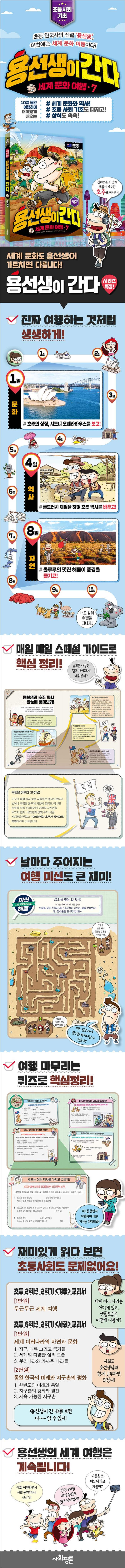 7권 호주에서는 가장 큰 도시 시드니부터 최남단 섬 태즈매니아까지 호주의 구석구석을 여행합니다. 블루 마운틴에서 귀여운 코알라를 만나고, 세계에서 제일 큰 바위 울루루에서 멋진 일출을 보며 신비한 자연을 만끽합니다. 또, 호주의 역사와 원주민, 자원에 대해서도 꼼꼼히 알아봅니다. 자, 이제 용선생과 함께 아름다운 자연과 신비한 모험의 나라 호주로 떠나볼까요?