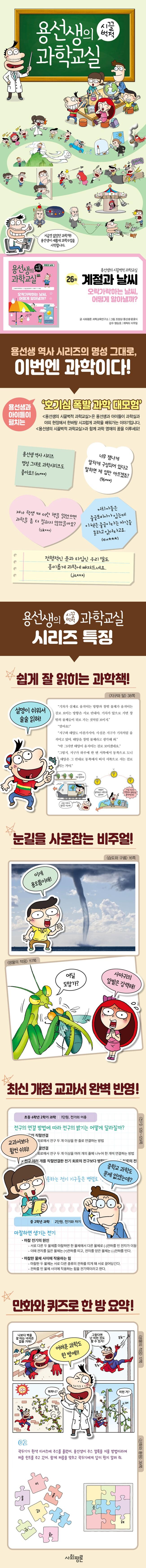 《용선생의 시끌벅적 과학교실 - 26 계절과 날씨》 편에서는 계절이 계속 변하는 까닭과 시시때때로 변하는 날씨에 대해 자세히 알아봅니다. 우리나라는 사계절이 뚜렷하고, 계절에 따라 다양한 날씨가 나타납니다. 앞으로 다가올 날씨를 미리 알 수 있다면 내일은 우산을 챙겨야 할지, 어떤 옷차림을 해야 할지 알 수 있겠지요? 이 책은 여름은 덥고 겨울은 추운 이유가 태양 고도가 변하는 것과 관련이 있다는 것을 알려주고, 태양 고도가 변하는 이유는 지구의 움직임 때문이라는 것을 차근차근 설명합니다. 기단과 전선, 기압과 태풍에 대해 함께 탐구하는 시간을 갖고 나면, 독자 어린이들은 여름은 덥고 겨울은 춥다는, 경험으로만 알고 있던 사실들을 과학적으로 설명할 수 있게 될 것입니다.